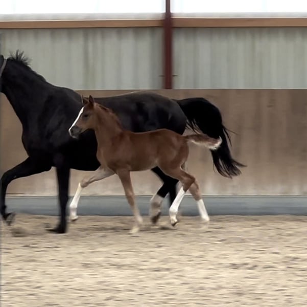 Wunderschönes großes, langbeiniges Dressurstutfohlen von Cellaho‘s Benicio aus einer Destano x Stedinger x Rohdiamant Mutter ! Man könnte sie wohl nicht schöner malen, ein Stutfohlen wie aus dem Bilderbuch - steht korrekt da mit viel Hals, Aufrichtung und wunderschönem Gesicht ! Sie besitzt einen sehr guten Schritt, taktvollen Trab mit genug Schulterfreiheit und einer sehr guten Bergaufgaloppade. Sie ist menschenbezogen und unkompliziert im Handling. Ihre Mutter wurde von uns selbst gezogen, deren Mutter war Seriensiegerin in A-M Dressur bis sie 6 jährig bereits in die Zucht ging. Ihr 3/4 Bruder ist SAM OLD (aus selber Mutter ) der 7 jährig bereits Grand Prix gewinnen konnte . Kopfklare und Rittige Mutterlinie mit sehr viel Bewegung und Schwung! Es gibt 2 sensationelle Vollgeschwister (bereits verkauft) zum Stutfohlen- wir geben sie gerne in fördernde Hände ab- die Qualität bringt sie mit .