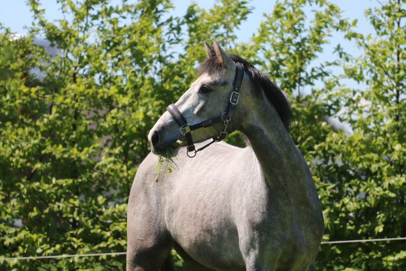 For sale: Oldenburg show jumping mare by ZINEDINE out of CASSONE, born March 2022, currently approximately 16.1 hh, grey. The mare has not yet been ridden under saddle but is already familiar with lunging with bridle and lunge line. She is well-behaved in daily handling. Viewings available by appointment. Price negotiable.