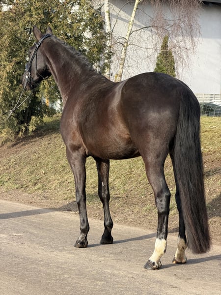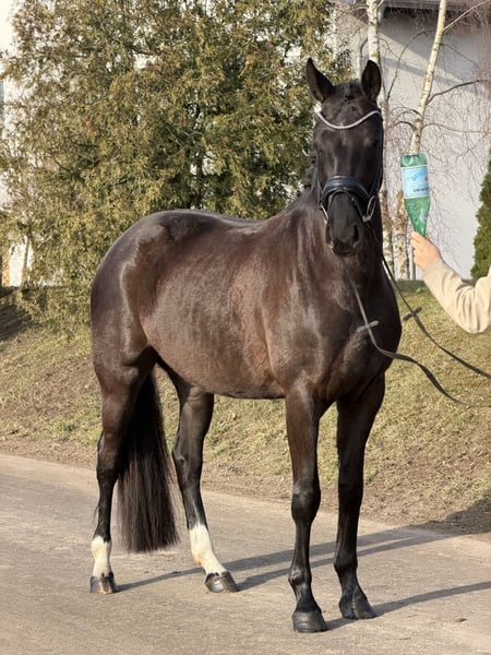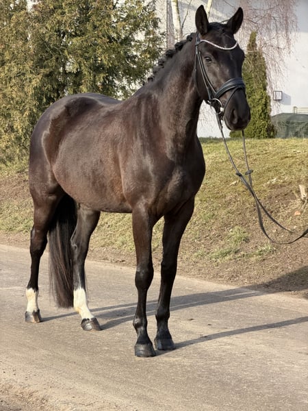 For sale is this beautiful Oldenburg mare in a rich bay color, sired by Moreno out of De Niro. She was backed at the end of last year and has been in ongoing training since then. She is very intelligent, sensitive, and attentive, learns incredibly quickly, and always aims to please her rider. Under saddle, she is very light and comfortable to ride, providing a very secure riding sensation. - 4-year-old bay mare - Approx. 16.1 hh - Moreno x De Niro - Healthy