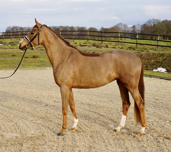 For sale: a promising Oldenburg mare, born in 2022. This elegant chestnut mare demonstrates strong foundational qualities. With a height of 16.1 hh, she offers the ideal size for ambitious dressage pursuits. She has been presented in solid, well-ridden condition and already shows initial signs of a harmonious basic training. Her refined conformation and balanced temperament make her a promising young talent for the dressage arena. This young Oldenburg mare is a true potential for high-level dressage and is suitable for both dedicated leisure riders and future competitive riders. If interested, I look forward to hearing from you.