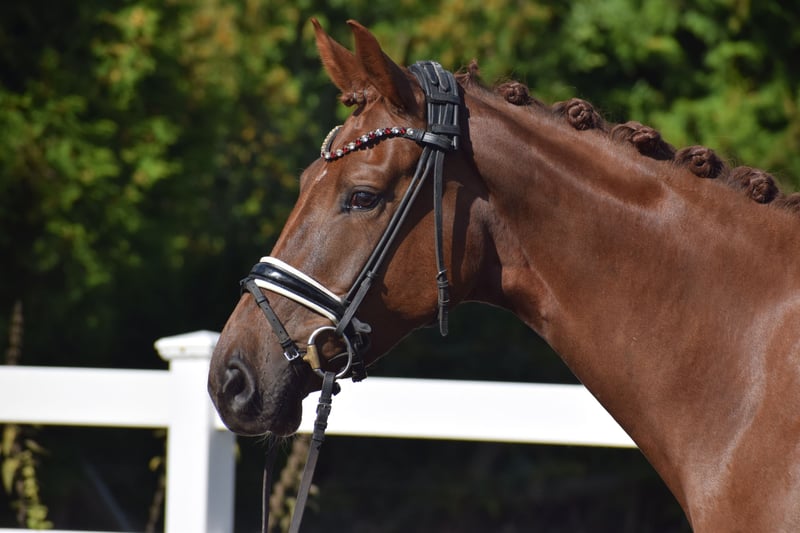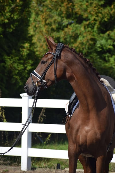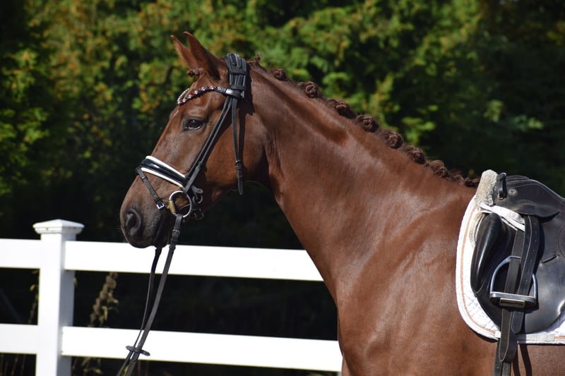 BEEINDRUCKEND BALANCIERTE 4 J. STUTE MIT ABSOLUT RUHIGEM & EHRLICHEN CHATAKTER - EIN TRAUM FÜR JEDEN DER FREUDE AM REITEN HABEN WILL - Junioren geeignet! Feldgoldstamm! Liebenswerte 4 j., 167 cm, ausgeglichene, Oldenburger Dunkelfuchsstute aus dem dirketen Feldgoldstamm von VALVERDE x ROCK FOR ME. „FELDBLÜTE“ besticht mit Optik, Charakter und beeindruckend gelassener Rittigkeit. Sie verfügt über drei gut balancierte Grundgangarten mit sehr guter Anlehnung. Sie besticht ebenfalls mit gutem Exterieur, harmonischer Gebäudeaufteilung, auffällig schönem Kopf und Seitenbild. Setzt sich „FELDBLÜTE“ in Bewegung, wird klar das sich hier ein Leistungsbereites, fein zu reitendes, gut balanciertes Pferd zeigt, welches es auch einem Amateur leicht machen wird, in Turnier- oder Abzeichenprüfunbgen, direkt fuss zu fassen. „FELDBLÜTE“ befindet sich seid dem einreiten im professionellen Beritt, konnte parallel jedoch immer schon von der Tochter des Besitzers mitgeritten werden. Sie befindet sich auf Dressurpferde A Niveau und lässt sich in fremder Umgebung von verschiedenen Reitern problemlos und unerschocken reiten. Sie hat freude an der Arbeit und könnte sofort in Reitpferde- & Dressurpferde A Prüfungen vorgestellt werden. „FELDBLÜTE´S“ Charakter lässt keine wünsche offen. Sie ist absolut ruihig, umgänglich, verschmust und dem Menschen sehr zugewandt. Sie hat ein absolut angenehmes ruhiges Wesen und ist mit anderen Pferde sehr sozial. Aufgrund ihrer ausgezeichneten Abstammung ist „FELDBLÜTE“ auch für die Zucht hochinteressant. Gerne kann „FELDBLÜTE“ nach dem Kauf bei uns im professionellen Beritt verbleiben. Ein aktueller, guter Röntgen-Tüv + klinischer Untersuchung liegt vor.