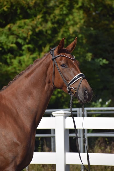 IMPRESSIVE LOVELY MARE WITH ABSOLUTELY CALM & HONEST CHARACTER - A DREAM FOR ANYONE WHO WANTS TO ENJOY RIDING - Suitable for juniors! For sale on behalf of the breeder is this lovable, balanced young horse from the direct Feldgold line of VALVERDE x ROCK FOR ME. Due to her pedigree, she is also extremely interesting for breeding. "FELDBLÜTE" impresses with her appearance, character, and remarkably relaxed rideability. She possesses three well-balanced basic gaits with very good connection, considering her young age. She also stands out with good conformation, a strikingly beautiful head, and profile. When "FELDBLÜTE" moves, it becomes clear that she is a performance-ready, easy-to-ride, well-balanced horse, which will also make it easy for an amateur to establish themselves in competitions or badge tests. "FELDBLÜTE" comes directly from the breeder's home and has been in professional training since being backed, but has always been ridden by the breeder's daughter in parallel. She is backed and is at riding horse level. Despite her young age, she can be ridden easily and calmly by different riders in unfamiliar environments. She enjoys working and could be presented in riding horse competitions immediately. "FELDBLÜTE's" character leaves nothing to be desired. She is absolutely calm, sociable, affectionate, and very people-oriented. She has a very pleasant, calm demeanor and is very social with other horses. Due to her excellent pedigree, "FELDBLÜTE" is also highly interesting for breeding. We wish this uncomplicated horse a loving home. "FELDBLÜTE" can remain in our professional training after purchase. A current, good vet check with 18 X-rays + clinical examination is available.