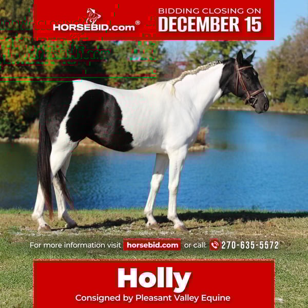 🎄𝐓𝐇𝐄 𝑯𝒐𝒍𝒊𝒅𝒂𝒚 𝐂𝐋𝐀𝐒𝐒𝐈𝐂🎄 Happening now thru MONDAY | DECEMBER 15th - Available EXCLUSIVELY on HorseBid's website! For more details and to register visit: www.Horsebid.com CONSIGNOR CONTACT: Pleasant Valley Equine 270-635-5572 LOCATION: Robards, KY BREED: German Oldenburg Verband REGISTERED: Yes REGISTERED NAME: Holly Rock CHF COLOR: Black & White Paint HEIGHT: 15.2 AGE: 4 GENDER: Mare A change in life circumstances and divorce has led to the sale of Holly Rock CHF (Rock Solid x FYF Hap Hazard), a talented and versatile 4-year-old mare. Having been started in her training, she has already participated in several fox hunting events, showcasing her exceptional walk, canter, and forward-thinking nature. With her athletic ability and versatility, Holly is well-suited for multiple equestrian disciplines, including Hunters and Eventing. She is registered with the German Oldenburg Verband and is designated as a Skewbald bay, as the organization does not recognize Paint colors. Her sire, Rock Solid (Rosenthal x El St. Parabola), boasts a distinguished dressage career, competing at the FEI levels, and hails from the renowned Abita/Elfi Hanoverian mare line. He has achieved numerous wins and titles, including a successful 70-day stallion test. His offspring are excelling in various equestrian pursuits, with some achieving Grand Prix levels and earning year-end titles. Holly has a great disposition and willingness to please that makes training and riding a wonderful experience. She has been through our desensitizing program. Holly enjoys playing with the tarps, balls, and pool noodles. She handles gunfire, bull whips, traffic, and ATVs. She is great out in the woods and has been trail ridden all over Kentucky and Tennessee. Holly is a blast in the arena. She is soft and supple in the mouth and gives laterally and vertically with minimal pressure. She gets her leads and even has a flying lead change. Holly started going over fences and seems to love it. She would make a great Eventer and Fox-hunter. If you're looking for your next Dressage mount, Holly will succeed in that discipline too. She has already started on many dressage moves. The sky's the limit with her. Holly is sold 100% sound with no vices. She is up to date on all vaccines & Coggins. She is currently barefoot & handled rocky terrain with no issues. Holly is easy to load, clip, bathe & stands well for saddling and bathing. Call today to set an appointment to meet Holly: 270-635-5572