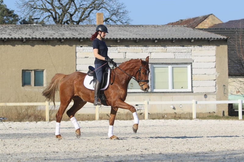 Zum Verkauf steht eine 5 jährige , ca 168cm große Fuchsstute mit bestem Charakter. Fayence ist trotz ihres jungen Alters ein wahrer Schatz. In der Herde eher rangniedrig, super sozial und brav zu allen anderen Pferden, artig beim Schmied , sowie im täglichen Umgang zum Beispiel beim Putzen, Führen etc. und lässt sich außerdem auch gut verladen und allein transportieren. Unter dem Reiter sieht es ähnlich unkompliziert aus. Sie kennt die Arbeit in der Halle, auf dem großen Außenplatz und auch Geländeritte ist sie gewöhnt und dabei immer händelbar und unkompliziert. Sie ist außerdem schon Turnier vorgestellt und war auch auf Anhieb vorne platziert. Fayence befindet sich dem Alter entsprechend auf einem guten Dressurpferde A Niveau und hat selbstverständlich das Talent und die Veranlagung für mehr. Sie besitzt einen kompletten Tüv ( Röntgentüv und klinisch getüvt) ohne Befund. Wer eine völlig unkomplizierte Partnerin mit Talent und dem Herz am rechten Fleck sucht, ist hier genau richtig. Wir könnten uns auf Grund ihres Charakters auch vorstellen, dass es mit schwächeren Reitern gut passen kann. Nur bei absoluten Reitanfängern bitten wir von Anfragen abzusehen.