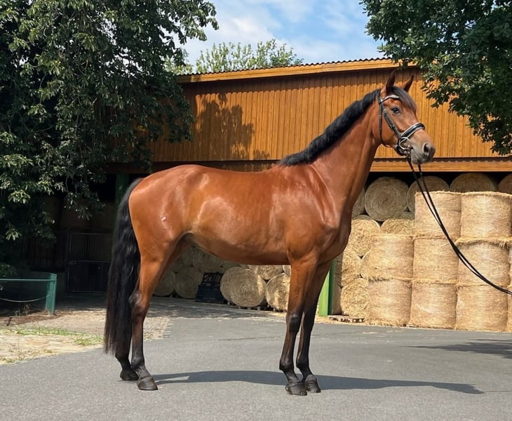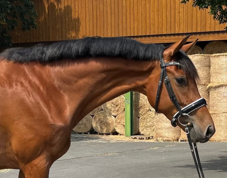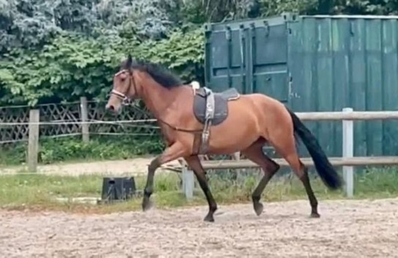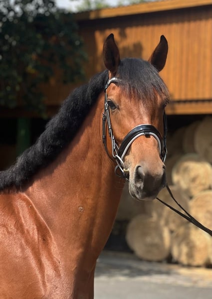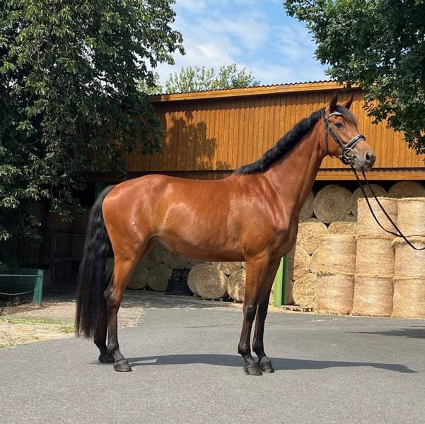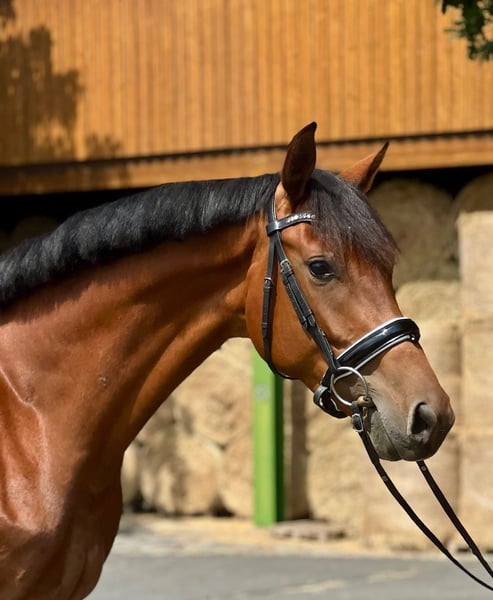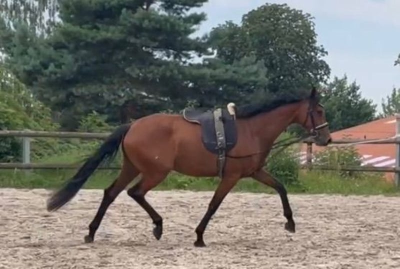 For sale is an elegant Oldenburg mare, born in 2021. This impressive bay stands at 169 cm and captivates with her harmonious build and appealing appearance. The mare shows great potential in dressage and is already well-trained. She has a pleasant, eager-to-learn nature and is very well-behaved both in hand and under saddle. Her movements are expansive and expressive, making her a promising partner for ambitious riders. Ideal for riders looking for a talented horse for dressage. If you are interested or need further information, please feel free to contact me.
