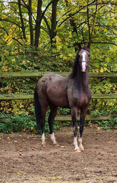 jolie jument Oldenburger baie foncée née en 2020, par Fürst Wilhelm / Dr. Jackson / Jazzman, avec quatre générations de juments d'élite dans le pedigree (stamm Walhdexe). Sa sœur aînée est déjà une jument de performance de haut niveau et a été invitée à la sélection d'élite à Rastede. Son frère complet du côté maternel a obtenu la qualification Sieger lors du BCH, avec plus de 40 victoires et de nombreuses places en S* et S**. D’autres sœurs sont également des juments d’élite ou de performance. La grand-mère est la sœur de deux chevaux de Grand Prix internationaux, d’un étalon agréé, de juments d’élite, etc. L’arrière-grand-mère a été la meilleure jument de la région pour les chevaux de dressage en Oldenburg, finaliste du BCH, mère d’étalon... La jument est en longe et connaît le poids du cavalier, mais pour le moment elle ne sort que en paddock. Seul une vidéo en liberté est disponible : https://www.youtube.com/watch?v=EjrLRhiMykk (Elle possède également un très bon pas, mais elle était un peu trop nerveuse lors de la vidéo). Au manège, c’est une jument absolument adorable. Elle nécessite cependant un cavalier expérimenté pour sa formation future. En raison de petits problèmes de santé, elle est proposée à un prix inférieur à sa valeur, mais selon son potentiel de reproduction, elle correspond à un niveau supérieur de jument de reproduction. Elle n’a pas encore eu de poulain. C’est une reproductrice potentielle exceptionnelle. Son pedigree est très fertile.