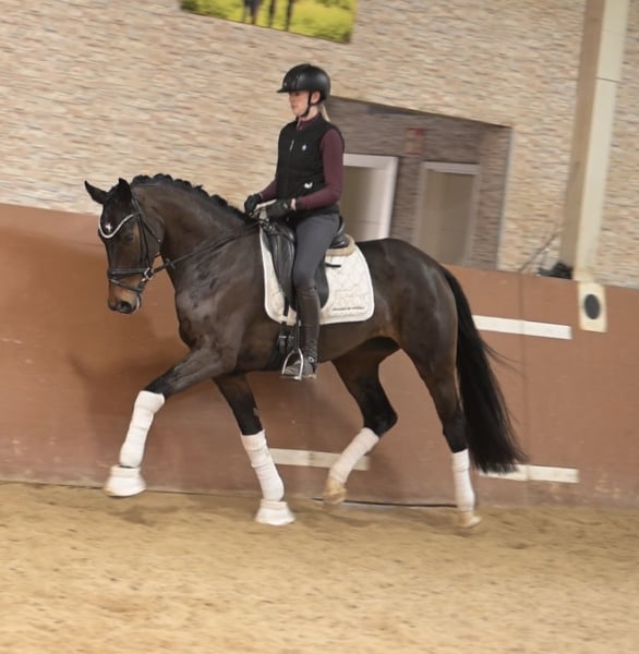 Liebe Interessenten, Für Terminvereinbarungen Probereiten senden Sie mir bitte eine WhatsApp. Für weitere Fragen bin ich tagsüber per WhatsApp erreichbar, telefonisch erreichen Sie mich am Besten zwischen 16 und 19 Uhr. Ich freue mich auf eine Kontaktaufnahme www.angelina-devittorio.de ⭐️Daily⭐️ Alter: 6 Jahre (2020) Größe: ca 1,65 m Abstammung: Donier x Breitling Ausbildungsstand: Dressurpferde A mehrfach siegreich und platziert AKU: Gute Röntgenbilder vorhanden Standort: 87700 Memmingen Zum Verkauf steht eine wunderschöne, kompakte sechsjährige Stute von Donier. Sie ist eine absolute Traumstute mit drei hervorragenden Grundgangarten, die sie bereits eindrucksvoll unter Beweis stellen konnte, unter anderem mit einem Sieg in einer Dressurpferdeprüfung der Klasse A. Im täglichen Umgang zeigt sie sich super lieb, unkompliziert und jederzeit brav, ihr Wesen ist ausgesprochen freundlich und angenehm. Auch unter dem Sattel ist sie brav und zuverlässig, benötigt jedoch einen etwas versierten Reiter, der sie korrekt weiter fördert. Sie ist niemals böse, eignet sich aber nicht für unerfahrene oder schwache Reiter. Für Amateure ist sie sehr gut geeignet, vorausgesetzt ein solides Reitniveau ab L. Aktuell befindet sie sich auf Dressurpferde-L-Niveau und ist demnächst startklar für diese Klasse. Gute Röntgenbilder liegen vor. Der Verkauf erfolgt aufgrund von Aufgabe des Reitsports und ausschließlich in allerbeste Hände. ⚜️Tel: 0171-3438949 ⚜️www.angelina-devittorio.de ⚜️a.devittorio@web.de ⚜️https://www.ehorses.de/angelinadevittorio Facebook und Instagram Angelina De Vittorio