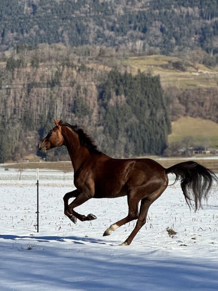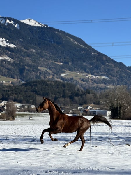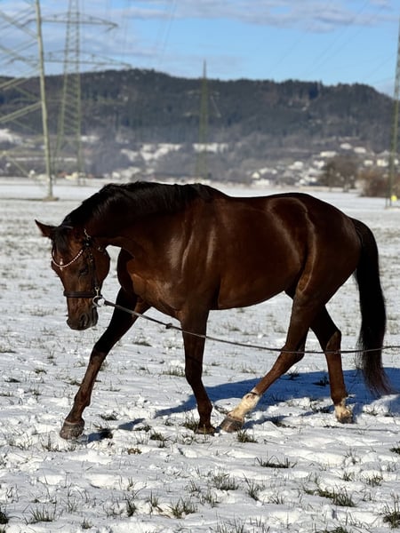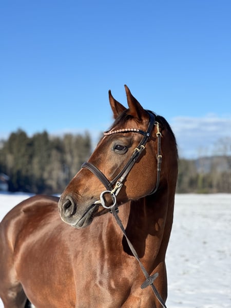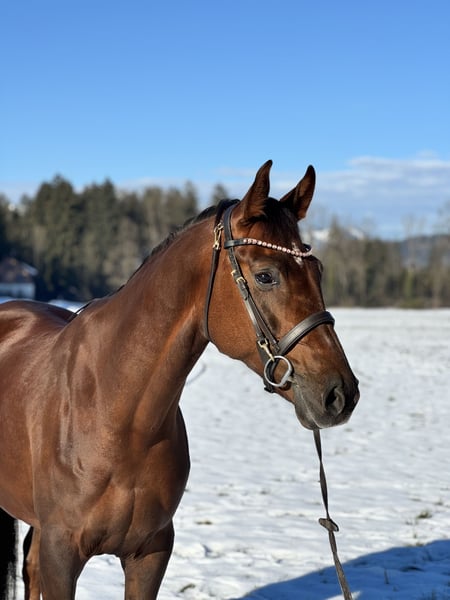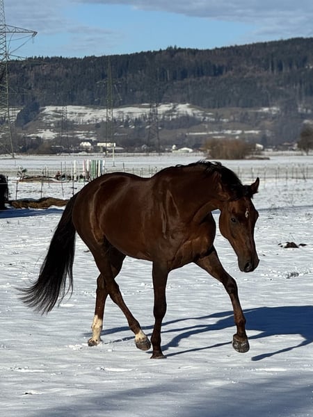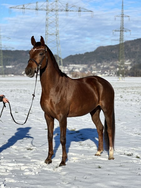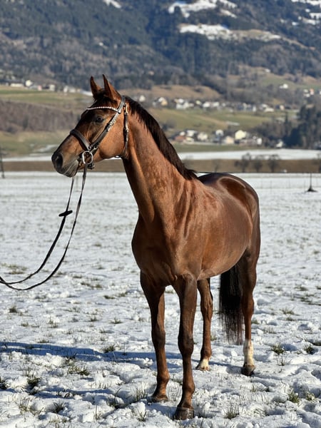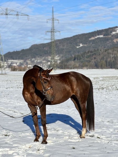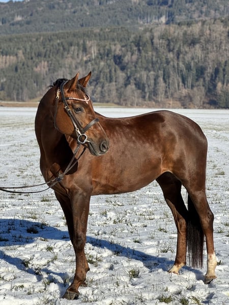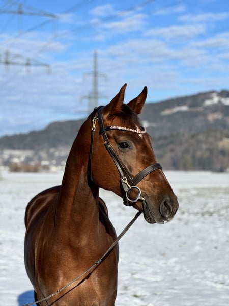 Bildhübsche 6-jährige Oldenburger Dunkelfuchsstute mit bestem Dressurblut. Zum Verkauf steht eine sechsjährige Oldenburger Dunkelfuchsstute Vision Sunny. Sie ist mit hervorragender Abstammung und absolut liebenswertem Charakter ausgestattet. Sie stammt ab von Vitalis, einem der erfolgreichsten Dressurvererber unserer Zeit. Die Mutter Fürstin Sunny geht zurück auf Fürst Romancier, weiter über Fürst Heinrich, bestes Dressurblut, das sich klar in Bewegung, Rittigkeit und Einstellung widerspiegelt. Die Stute überzeugt mit schönen, schwungvollen Grundgangarten, ist sehr angenehm zu sitzen und besitzt einen schönen raumgreifenden Galopp. Sie ist fein im Maul, sehr rittig, lernwillig und stets leistungsbereit mit einem angenehmen Vorwärtsdrang. Aktuell ist sie in allen Grundgangarten geritten und auch im Gelände brav unterwegs. Sie springt auch einen kleinen Parcours. Im Umgang wie auch unter dem Sattel ist sie unglaublich brav und zuverlässig. Sie kennt keinerlei Unarten, kein Steigen, Bocken oder Durchgehen. Absolut nicht schreckhaft, immer ruhig und verlässlich. Auch charakterlich ist sie ein echter Schatz: Ein total lieber, menschenbezogener Charakter, sie kommt einem direkt entgegen, möchte gefallen und etwas mit ihrem Menschen unternehmen. Sehr freundliches Wesen, sozial und gut verträglich mit anderen Pferden. Dazu bringt sie eine super Größe, ist bildhübsch und ein absoluter Eyecatcher . Vision Sunny ist ein Pferd, das sowohl sportlich als auch optisch begeistert. Bei Interesse bitte telefonisch oder per WhatsApp melden: +43 680 5011 366 Probereiten: 30 € Ein ehrliches, braves und talentiertes Pferd mit ganz viel Herz.