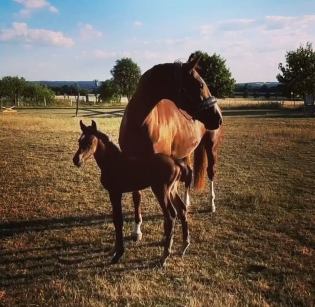 With a heavy heart due to personal circumstances, I am selling my 7-year-old chestnut mare, standing 16.1 hh, by Coupe de Coeur out of Balou du Rouet x L.A. She is currently in foal to Chubakko (Beerbaum Stallion Station) for late April / early May 2026, with a colt foal from 2025 at her feet, which will be weaned at the end of October 2025. She has been ridden in the past, but over the last 1.5 years, her riding has been very irregular to almost nonexistent, so a trial ride is currently not possible or desired. In spring 2024, she suffered an infected tooth that was unfortunately not diagnosed immediately and had to be extracted. This may cause some issues with her connection to the bit, so she is not being sold as a future sport, competition, or show jumping horse, but she is rideable in principle. I ride her occasionally for leisure—lightly in the arena or in the field, about every 2-3 weeks. Due to her spirited nature, she is not suitable for beginners or nervous/unsure riders. She is very uncomplicated in handling; veterinary treatments and insemination have been carried out without issues or sedation. She has also been bred naturally before. Loading onto trailer or truck and farrier work are no problem. A 2022 health certificate with 22 radiographs, including the back, is available. She has two small chips, but according to several vets, these are considered harmless and have never caused any issues or restrictions. She is being sold solely as a broodmare due to the known "defects." The foal from this year is very promising and has been awarded premium. The cross with Chubakko shows great potential. Asking price is €5,500. Additionally, a breeding fee of €900 plus VAT for the cover in 2026 at the Beerbaum Stallion Station is to be paid by the buyer upon foal registration, which can be transferred with the sale. Please feel free to contact me with any questions.