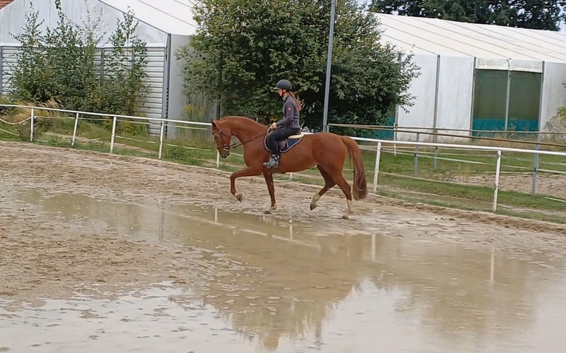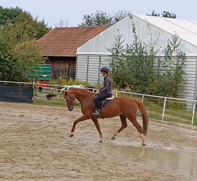 Z przykrością sprzedaję moją siedmioletnią, 1,66 m wysoką kasztanowatą klacz, pochodzącą od Coupe de Coeur x Balou du Rouet x L.A., ze względu na zmiany w życiu prywatnym. Obecnie jest w ciąży z trzecim źrebięciem, planowanym na koniec kwietnia lub początek maja 2026 roku, z ogiera Chubakko (stajnia hodowlana Beerbaum). W 2025 roku urodziła źrebię ogierka, które jest pod siodłem i będzie odstawione pod koniec października 2025 roku. Klacz jest w zasadzie jeżdżona, jednak przez ostatnie 1,5 roku była bardzo rzadko, a w niektórych okresach niemal wcale, dlatego obecnie nie jest możliwe ani pożądane jej jazdowe przymiarkowanie. Wiosną 2024 miała zapalenie zęba, które niestety nie zostało wcześnie wykryte i musiało zostać usunięte. Prawdopodobnie przez to ma problemy z akceptacją wędzidła, dlatego nie jest sprzedawana jako przyszła klacz sportowa, konkursowa czy skokowa, choć w zasadzie jest jeżdżona. Od czasu do czasu jeżdżę ją rekreacyjnie – od czasu do czasu na placu, czasem w terenie na 2-3 tygodnie. Ze względu na jej energiczny charakter nie jest odpowiednia dla początkujących, nerwowych lub niepewnych jeźdźców. W kontaktach jest bardzo spokojna i bezproblemowa, badanie weterynaryjne i inseminacja bez problemu, również naturalne krycie. Nie ma problemów z załadunkiem do przyczepy lub ciężarówki, a także z podkuwaniem. Posiada ważny certyfikat z 2022 roku, obejmujący 22 zdjęcia rentgenowskie, w tym zdjęcia kręgosłupa. Ma dwa chipy, które według kilku weterynarzy nie stanowią zagrożenia i dotąd nie sprawiały żadnych problemów ani ograniczeń. Sprzedaję ją głównie jako klacz hodowlaną ze względu na jej ewentualne wady. Źrebię z tego roku jest bardzo udane i zostało wyróżnione. Połączenie z Chubakko jest bardzo obiecujące. Cena to 5500 euro. Do tego dochodzi opłata za krycie w wysokości 900 euro netto (decktaxa 2) przy urodzeniu źrebięcia w 2026 roku, którą kupujący pokryje na stajni hodowlanej Beerbaum, a która zostanie odjęta od ceny sprzedaży. W razie pytań proszę o kontakt.