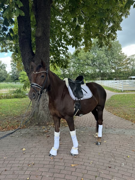 Bildschöne Dunkelfuchsstute *2019 1,67m groß La Vie x Don Romantic Aufgrund von Zeitmangel sucht Cleo ein neues 5* Zuhause. Sowohl im Umgang als auch beim Reiten sehr brav und bis Dressurpferde M Niveau ausgebildet, Wechsel allerdings noch etwas grün. Das Video ist im Training entstanden und nur ein kleiner Zusammenschnitt, dabei trägt sie zum ersten Mal eine Kandare. Ist auf Trense problemlos zu reiten. Gute Röntgenbilder aus Dez inkl. Hals und Rücken vorhanden. Für mehr Informationen und Videos bitte Nachricht/ Anruf an +49 1721636835
