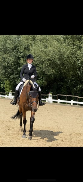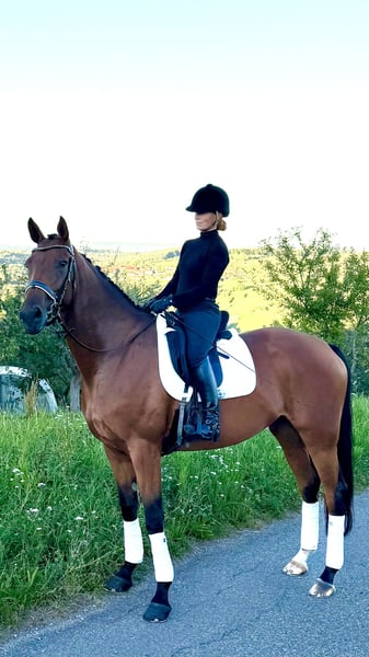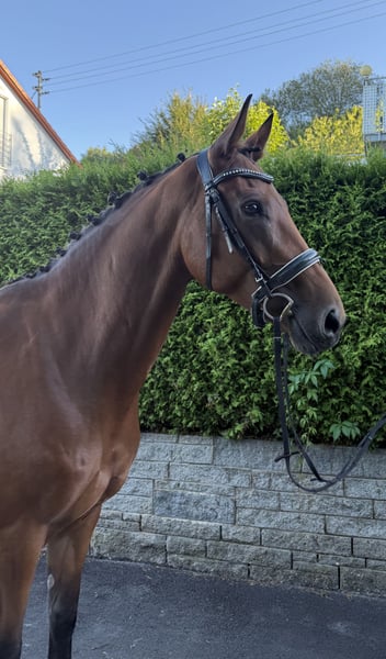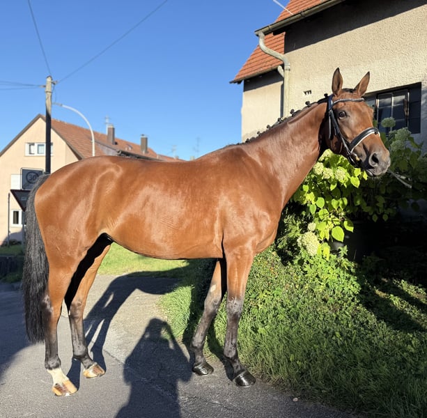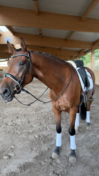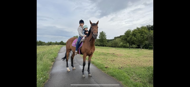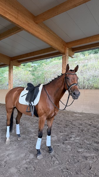 For sale is a charming mare, born in 2019, with a height of 1.68 m – a true all-round talent with an excellent pedigree and a heart in the right place. 🔹 Parentage: Sire: Secret (Sezuan x St. Moritz) – Vice-World Champion of young dressage horses, Bundeschampion, and one of the most sought-after sires of his generation. He is known for outstanding rideability, movement quality, and a clear mind. With over 50 licensed sons and numerous high-priced auction foals, Secret is considered an exceptional talent in modern dressage horse breeding. Dam's sire: Guzzi – brings athletic toughness, willingness to perform, and versatile potential. 🔹 Usage & Character: Our mare is not only an eye-catcher visually but also impresses with her honest and uncomplicated character: - Already placed in show jumping competitions 🏅 - Ridden confidently and calmly by younger riders - Reliable in the field, making her a true family horse - Well-behaved in daily handling, good with the farrier and loading She combines athletic potential with a great disposition, making her interesting for both the ambitious amateur and the whole family. 👉 Facts at a glance: Born: 2019 Height: 1.68 m Color: Bay Parentage: Secret x Guzzi Usage: Dressage, Show Jumping, Cross-Country, Leisure & Breeding ✨ A mare that simply brings joy – in the arena, in the course, in the field, or as a loyal partner in everyday life! You can also find some additional insights on my Instagram account: alexxbaumann The mare has been with me since she was 7 months old, raised at my home, I have backed her and trained her, so she has grown up with a lot of love in a family environment ❤️
