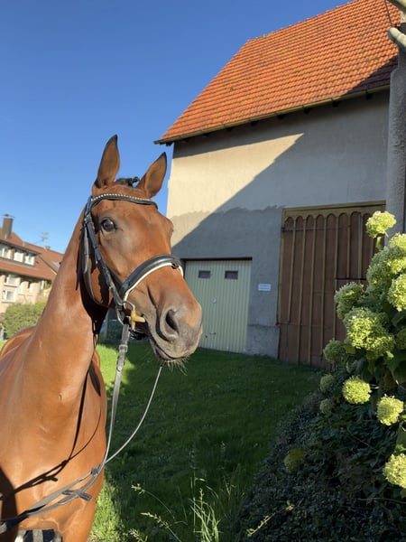 Zum Verkauf steht eine sympathische Stute, geboren 2019, mit einem Stockmaß von 1,68 m – ein echtes Allroundtalent mit bestem Pedigree und Herz am rechten Fleck. 🔹 Abstammung: Vater: Secret (Sezuan x St. Moritz) – Vize-Weltmeister der jungen Dressurpferde, Bundeschampion und einer der gefragtesten Vererber seiner Generation. Er steht für herausragende Rittigkeit, Bewegungsqualität und einen klaren Kopf. Mit über 50 gekörten Söhnen und zahlreichen hochpreisigen Auktionsfohlen gilt Secret als Ausnahmetalent in der modernen Dressurpferdezucht. Muttervater: Guzzi – bringt sportliche Härte, Leistungsbereitschaft und vielseitige Veranlagung mit. 🔹 Einsatz, Charakter & Erfolge: Unsere Stute ist nicht nur optisch ein Blickfang, sondern überzeugt vor allem durch ihren ehrlichen und unkomplizierten Charakter: • bereits platziert in einer Springprüfung Klasse A🏅 • sowie Siegreich in einer Gewöhnungsspringprüfung🥇 • aktuell 5. Platz in einer Dressurprüfung der Klasse A, sogar mit Fremdreiter – das unterstreicht ihre Nervenstärke, Rittigkeit und Verlässlichkeit • wird auch von jüngeren Reitern sicher und brav geritten • zuverlässig im Gelände und damit ein echtes Familienpferd • brav im täglichen Umgang, schmiede- und verladefromm Sie vereint sportliches Potential mit einem tollen Wesen und ist damit sowohl für den ehrgeizigen Amateur als auch für die ganze Familie interessant. 👉 Fakten auf einen Blick: Geboren: 2019 Stockmaß: 1,68 m Farbe: Brauner Abstammung: Secret x Guzzi Einsatz: Dressur, Springen, Gelände, Freizeit & Zucht ✨ Eine Stute, die einfach Spaß macht – im Viereck, im Parcours, im Gelände oder als treue Partnerin im Alltag! Den einen oder anderen weiteren Einblick gibt es auch auf meinem Instagram-Account: alexxbaumann Die Stute ist seit ihrem 7. Lebensmonat bei mir zu Hause aufgewachsen. Ich selbst habe sie angeritten und ausgebildet – sie ist also mit viel Liebe in familiären Verhältnissen aufgewachsen ❤️ 💶 Hinweis zum Probereiten: Da wir zukünftig Reittourismus zum Wohle dieser tollen Stute vermeiden möchten, werden wir für das Probereiten 40 € pro Proberitt berechnen. Bei einem zustande kommenden Kauf werden diese Kosten selbstverständlich voll mit dem Kaufpreis verrechnet.