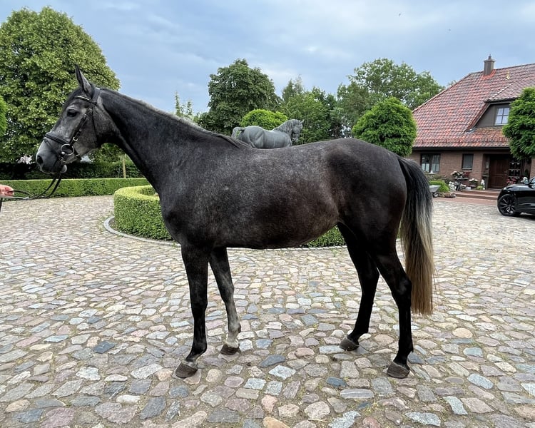 for sale is a 4 year old mare by Cellestial - Conoso, she is unused has Shivering in her left hind leg. She is currently wearing Tornado ( Toulon x Diamant de Semilly x Voltaire ). Her full brother Corfield is a licensed 5-year-old stallion at the Redefin State Stud and serial winner in show jumping competitions up to class M. If you have any further questions, videos or help with transport, please do not hesitate to contact us.
