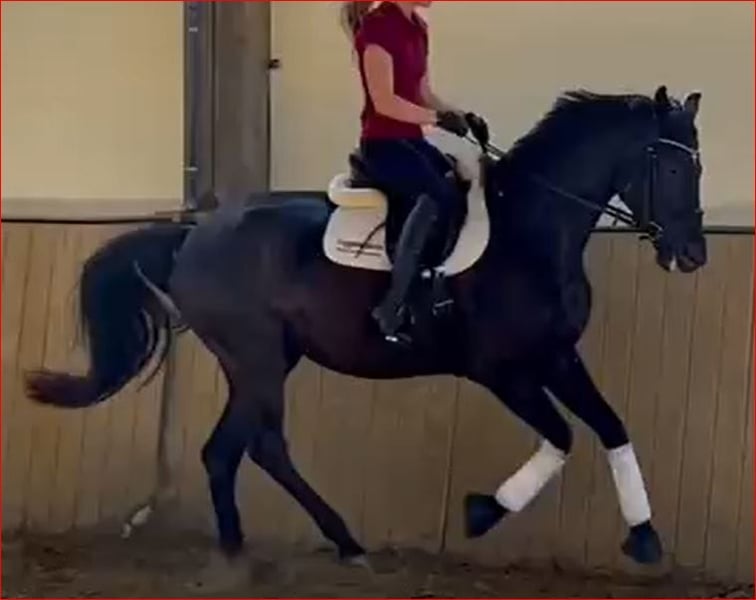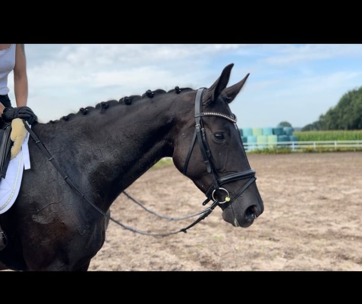 Elegant, expressive and very people-oriented 5yo black mare by the rideable sire Millenium. Black mare by the rideability sire Millenium out of a KWPN mare by Undigo. Dressage genes from Sandro Hit x Jazz are combined here. This very uncomplicated and head-clear mare has a lot of talent for dressage as well as jumping, but has not yet been ridden in jumping. As a 3-year-old she was still growing and was only worked a little on the ground because, as an intelligent horse, she simply needed head work. At the beginning of her 4th year she was lightly broken in and was put out to pasture again at the end of the summer. She has been ridden again since the beginning of March and is keen to work, learns very quickly, enjoys variety and is fun to watch. She has grown up in a herd with plenty of fresh air and is very social, self-confident and always fair. Mare performance test on 12.07.24