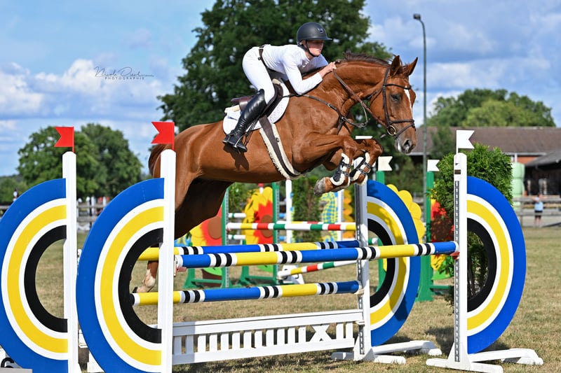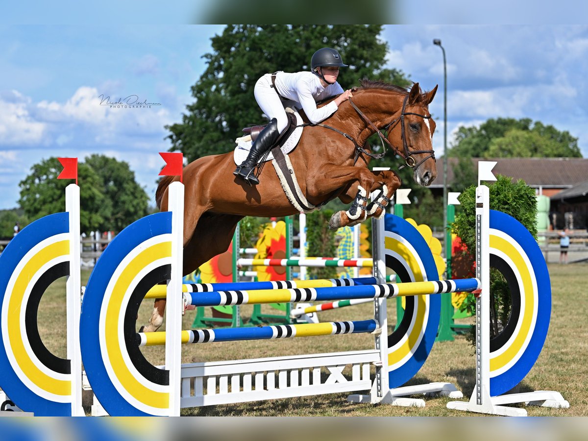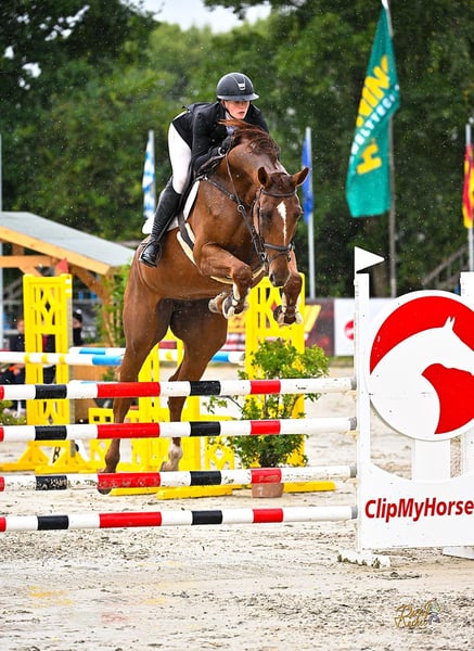 7-year-old mare, approximately 16.9 hh, by Chacfly Carember de Muze. Born in Lewitz. Presented up to show jumping horse class M, with more training already underway. She has a lot of potential and is quite cautious. At competitions, she mainly focuses on her environment between jumps. She needs someone who has more time to train her properly and to regularly compete. TUV available.