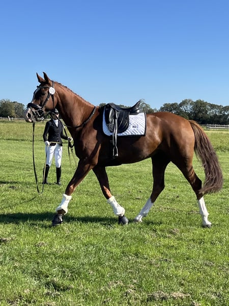 Aktuelle Röntgenbilder (Huf, Bein, Rücken vom 16.03.2026) OHNE BEFUND Können bei ernsthaftem Interesse versendet werden. | Alter: 8 Jahre | Stockmaß: 166 cm | Abstammung: Dancier x Rubinstern Noir | Farbe: Dunkelfuchs Danci überzeugt nicht nur durch ihr elegantes Exterieur, sondern auch durch ihr Talent und ihre Rittigkeit. Bereits A-Dressuren mit Noten um 8,0 gewonnen, sicher in L-Lektionen eingeführt, Außengalopp und fliegende Wechsel beherrscht sie spielerisch. Sie ist fein an den Hilfen, leicht in der Hand, sensibel und sehr lernbereit – ideal für ambitionierte Reiter mit feinem Sitz und Erfahrung in der Jungpferdeausbildung. Wer ihr Sicherheit und Vertrauen gibt, findet in Danci eine Partnerin mit Perspektive bis in die höhere Dressur. Im täglichen Umgang ist sie unkompliziert, menschenbezogen und anhänglich. Röntgen-TÜV ohne Befund, regelmäßig geimpft, entwurmt und Zähne gemacht. Wir wünschen uns für Danci ein liebevolles Zuhause mit artgerechter Haltung und Pferdegesellschaft. Platz vor Preis. Vorstellung und Probereiten nach Absprache (50 € Aufwandsentschädigung, bei Kauf verrechnet).