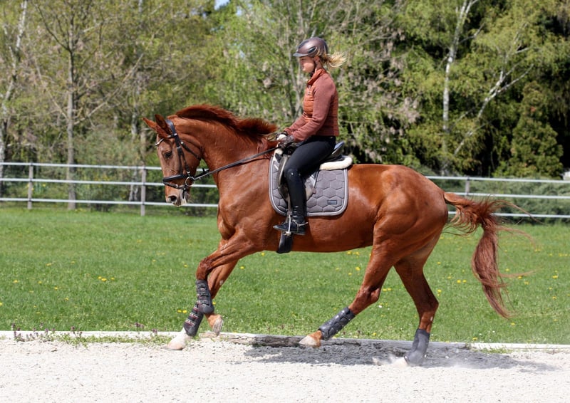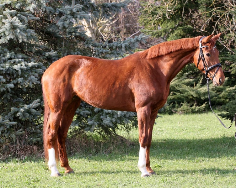 For sale: 8-year-old Oldenburg mare Le Vivaldi x Fürst Heinrich with a height of 172cm, directly from the breeder. The mare has been started and trained by the breeder, has always been in one hand, and is a cuddly horse. Transport and farrier are no problem. She has never been sick or injured, has no vices, and comes with a 1* vet check including back X-rays. The chestnut has very good movement, is very willing to work, and always wants to do everything right. Trained up to LM level. Only to be placed in good hands.