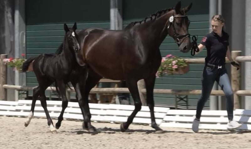 Mare by Bernay Rubinstein, born in April 2017, has completed her mare performance test and has since produced three outstanding foals, all of which are elite foals. She is a very gentle mare, confident and fearless in the field, and handling routines such as loading onto the trailer, farrier work, and vet visits are no problem. She would now need to be restarted.