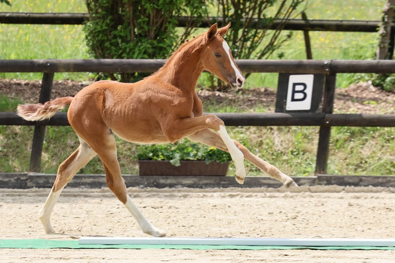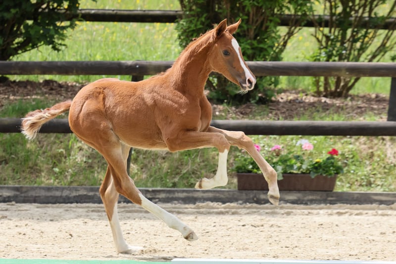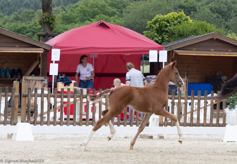 Vertrauensvoll und willig mitarbeitend war sie vom ersten Tag an. Mit natürlicher Präsenz punktet sie in allen Gangarten, insbesondere auch einem absolut überragenden Galopp. Zusammen mit ihrer Übersicht bringt sie also beste Vorausetzungen für die spätere Ausbildung mit. Das Pedigree ist sportlich geprägt. Veneno war Mannschafts-Gold Gewinner bei der WM der Junioren. In den wenigen Jahren seines Zuchteinsatzes brachte er u.a. die Hengste Valdiviani und Va Bene. Auf der mütterlichen Seite steht der schmale Vollblut-Leistungsstamm einer Tochter des Mansingh xx, Vater auch von Langata Express xx. Ihre Familie umfasst bisher einen gekörten Hengst, mehrere Prämienstuten und viele geliebte kopfklare Partner von Reiterinnen im Amateursport bis zur schweren Klasse. Ein Besuch im Gestüt Stöckerhof in Hennef ist nach Vereinbarung jederzeit möglich
