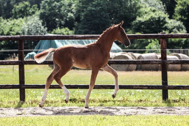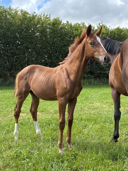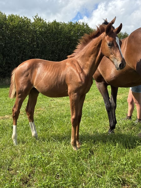 Eberhofer…typvoller Hengstjährling vom WM Silber -und Bronzemedaillen Gewinner Escamillo. Mütterlich entspringt er dem Oldenburger Erfolgsstamm der Elfenblume, gehegt und gepflegt von Ewald Grotelüschen. Mutter Elfenmelodie erhielt aufgrund ihrer Nachzucht den Titel der Verbandsprämie. Sie lieferte mehrere Auktionsfohlen. Mit Elfensynphonie v. Vitalis stellte sie die zweifache Holsteiner Landeschampionesse und Bundeschampionatsfinalistin, jetzt S-erfolgreich. Der Hengst ist bei uns geboren, artgerecht mit seinen Freunden aufgewachsen , geimpft und entwurmt und regelmäßig dem Schmied vorgestellt. Er ist sehr menschbezogen und immer freundlich im Umgang. Auf Wunsch kann er bei uns in der Aufzucht bleiben. Weitere Infos gern unter 01749049299.