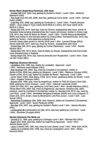 Sportivo e allevato da uno dei più riusciti ceppi di fattrici - nato il 21.05.2025 La madre, la fattrice di elite Honey Moon, ha già prodotto cinque cavalli di punta di successo S e fattrici premiate dallo stato, tra cui: Cold Play da Contendro I (1,65 m sotto Fredrik Jönsson (SWE) e medaglia d'argento a Tryon (USA) 2018); Quidam MB da Quidam's Rubin (internazionale 1,60 m con Adrienne Sternlicht (USA)); The Dude da Carry Gold (1,60 m sotto Samuel Hutton (GBR)); Cornet Star da Cornet Obolensky (internazionale 1,45 m con Rachel Sandoz (SUI)) e Honey Pearl da Emerald van’t Ruytershof (internazionale 1,45 m - Dries van der Linden (BEL)); Honey Girl da Clinton (fattrice premiata dallo stato e di elite con discendenti di successo internazionale S**); Honey Star da Balou du Rouet (fattrice riserva della mostra di elite delle fattrici a Rastede con un 10,0 nel salto libero); ulteriori cavalli di successo dal ceppo materno vedi foto.