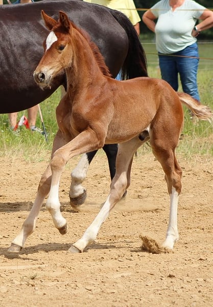 Hengstfohlen von Kjento aus einer Staatsprämienstute vom Sir Donnerhall x De Niro. Dieser tolle Nachwuchssportler besticht durch ein wunderschön aufwärts modelliertes Gebäude, viel Schulterfreiheit und ein bildschönes Gesicht. Ihre Mutter Sissy war ihrer Zeit in der Kollektion der Hannoveraner Reitpferdeauktion, Siegerin in Dressur- und Reitpferdeprüfungen, erfolgreich auf der "Herwart von der Decken Schau" und erhielt die Staatsprämie. Sie hat einen Charakter aus Gold und dient bei uns neben der Zucht als Lehrpferd für den Nachwuchs und Lebensversicherung für unsichere Reiter. Ihren tollen Charakter, Reitkomfort und Qualität für alles geforderte im Viereck gibt Sissy ihren Nachkommen mit. Diese können mit Siegen in Dressurpferdeprügungen und Prämierungen als Fohlen glänzen. Sichern Sie sich dieses tolle Fohlen als großartige Offerte für den Dressursport oder perspektivisch für Zucht. "Kjeld" ist aufgeweckt, mutig und hat ein ausgeglichenes Wesen. Er ist menschenbezogen und gut sozialisiert. Alle Fohlen wachsen bei uns mit Familienanschluss auf, kennen Landtechnik, Hunde, Ziegen, Katzen, stehen auf riesigen Weiden im Herdenverband. Inzahlungnahme, Tausch oder Ratenzahlung kommt nicht in Frage. Direkt vom Züchter Standort 17166, MV