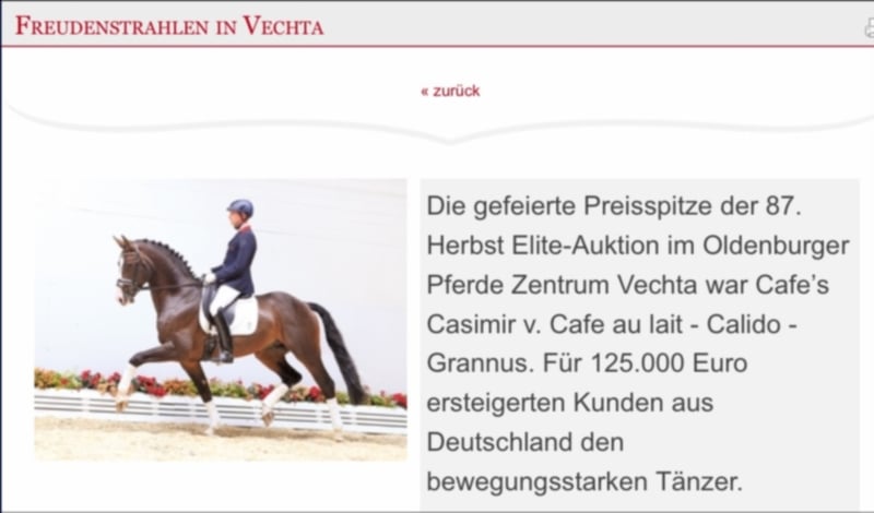 Sprawdzona wydajność i jazda konna Sire m. Top potomstwa! Cafe au Lait, zwycięzca pokazu skoki Hodowla koni stowarzyszenie Oldenburg-International. Został oceniony najwyżej z 8,10 w 21-członek badanie pole 30-dniowy test w Neustadt/Dosse. Pełna brat Cody (Bundeschampion z sześcioletniego pokazu skoków koni 2002, również Hodowla koni Kuhlmann) Cafe au Lait ma kilka zatwierdzonych potomstwo i niezliczone udane potomstwo w użery i skoki do s * * *. Wszyscy przekonują niesamowitą ilością jazdy i jakości ruchu, optymalnym ustawieniem pracy i dużą zdolnością skakania. W Herbst Eiliteauktion w Vechta jeden z jego wielu ustrzykanych potomstwa (Cafe au Lait x Calido I x Grannus) z naszej rasy osiągnął najwyższą cenę i jest teraz 7 lat zwycięzca serii S-dressages! W Ankumer Dressur Club, klacz z naszej grupy hodowlanej, również z naszej hodowli, niedawno umieścił się w zawodach ulewnych klasy ciężkiej i jest teraz zwycięski w Inter II. Cafe Champus został Runner-up w młodych koni pod Rene Tebbel i jest również w talii. Cafe au Lait sam był finalistą Bundeschampionats pod Philipp Weishaupt i udała się do S * * * skoki, ale jest również wyposażony w trzy spektakularne GGAs i przeszkolony na poziomie S. Stacjonując przez Paula Schockemöhle, on już produkowane kilka międzynarodowych udanych skoków koni, w tym "Royce", zwycięsko w FEI CSI5 * ' 500 000 Rolex Grand Prix Wellington. Jeden z niewielu podwójnych ogierów dla ciężkich zajęć! Czysta ciemna, dziedziczona przeważnie kolorowa. Wskaźnik ciążowy w ostatnich latach zawsze 100%!! Dostępne są pola Gości. WFFS negatywne!