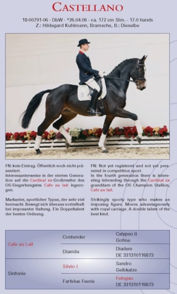 Bewezen prestaties en rijdbaarheid vader met top nakomelingen! Cafe au lait, winnaar van de springpaardenfokkerijvereniging Oldenburg-International. Werd beoordeeld als de hoogste in de 21-koppige test veld van de 30-daagse test van Neustadt / Dosse met 8,10. Volledige broer aan Cody (Federaal Kampioen van zes-jaar-oude show springende paarden 2002, ook paard het fokken Kuhlmann) Cafe au lait heeft verschillende gelicentieerde nakomelingen en talloze succesvolle nakomelingen in de dressuur en show springen tot s ***. Ze overtuigen allemaal met een ongelooflijke mate van rijdbaarheid en bewegingskwaliteit, optimale werkhouding en veel springvermogen. Op de Autumn Eilite Auction in Vechta behaalde een van zijn vele dressuurnakomelingen (Cafe au lait x Calido I x Grannus) uit onze fokkerij de hoofdprijs en is nu 7-jarige seriewinnaar in de S-dressuur! Op de Ankumer Dressage Club plaatste onlangs een merrie uit onze fokkerij zich van Cafe au lait x Calato in dressuurwedstrijden van de zware klasse en zegevierde nu in Inter II. Cafe's Champus werd tweede in de jonge paarden onder Rene Tebbel en is ook in dek gebruik bij ons. Cafe au lait zelf was bundeschampionats finalist onder Philipp Weishaupt en is succesvol tot S*** springen, maar is ook uitgerust met drie spectaculaire GGAs en getraind dressuur op S niveau. Gestationeerd bij Paul Schockemöhle, heeft hij al verschillende internationaal succesvolle springpaarden geproduceerd, waaronder "Royce", zegevierend in de FEI CSI5* '500.000 Rolex Grand Prix Wellington. Een van de weinige dubbele verervers voor de zware klassen! Puur donker, geërfd meestal kleurrijk. Zwangerschap tarief in de afgelopen jaren altijd 100%! Gastendozen beschikbaar. WFFS negatief!