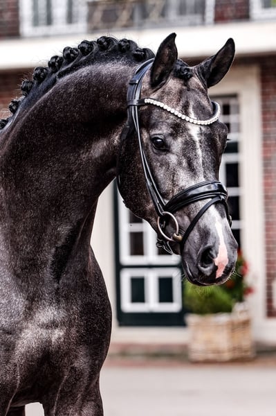 Bondolo was licensed in Redefin in 2023 and immediately impresses with his strong type, charming nature and beautiful face. His first-class basic gaits stand out in movement, whereby his very good walk is particularly noteworthy, which is characterized by enormous rhythmic clarity, suppleness and a clear overstride. Bondolo is by the successful sire Bonds, who already has numerous licensed sons and top prizes from auctions and led the FN breeding value assessment in young horse tests in 2021. Bonds himself was a serial winner in tests for young dressage horses and successful up to advanced level. His offspring are particularly appreciated for their high rideability values, excellent movement quality and strong type. Bondolo's pedigree is rounded off by the modern dressage horse makers Benicio, Sir Donnerhall and Rubinstein I. Bondolo's dam's sire Totilas was probably the most famous dressage stallion and moved people far beyond the sport of dressage. He set three world records and was three-time World Champion and two-time European Champion, as well as two-time Dutch Champion and two-time German Champion. In 2010 Totilas won the World Cup Final in 's-Hertogenbosch, Netherlands. His third dam Pia produced the advanced (S) level dressage horse Walk of Life by Wolkentanz II.