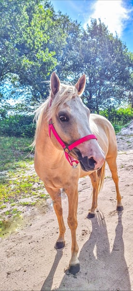 Due to sad circumstances, I have decided to stop with equestrian sports. With a heavy heart, I am looking for a new home for my purebred, super beautiful, very sweet mare (1.50 m, a cross between Paint and Quarter Horse, ridden Western) who is only 6 years old and has a whole life ahead of her, where she will be kept outside in a herd as a recreational trail horse (she does not like the arena and stable). She puts in a lot of effort in groundwork, loves the woods, and is almost never startled. I have videos of her in the woods, doing spook training, in the herd, etc. (with proper training, she would be a great little horse for trail rides). She is ridden bitless. She has grown up in a herd with mares and geldings, Paints and Quarters of different ages since she was a foal. She was started under saddle at 3.5 years old and has been ridden exclusively in the woods for 1.5 years, where she is very well-behaved. Last May, I had her thoroughly examined at a horse clinic in Germany, including X-rays of her head, neck, back, and legs. No abnormalities were found, and she was declared 100% healthy. In the last year, I have focused a lot on groundwork and ridden her very little to help her find more balance and grow nicely. She deserves a home where she is well understood, as she is super sweet, a bit sensitive, but very cool-headed. If she doesn't understand something, she stays calm, and if you explain it again, this sweetheart will do anything for you—truly a "buddy ♡ for life." This is a horse with whom you build a fantastic one-on-one bond, and with whom you can confidently ride through the entire forest in the future. If you have little patience, then this sweet mare is not for you; she also stands up for herself, and rightly so. When you arrive in the pasture or paddock, she always runs to you for a cuddle; she is very people-oriented (as can be seen in the video). Do you think you could be the buddy for life for this fantastic sweet mare? Let me know.