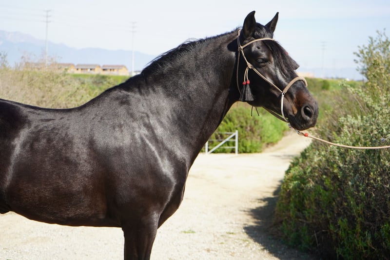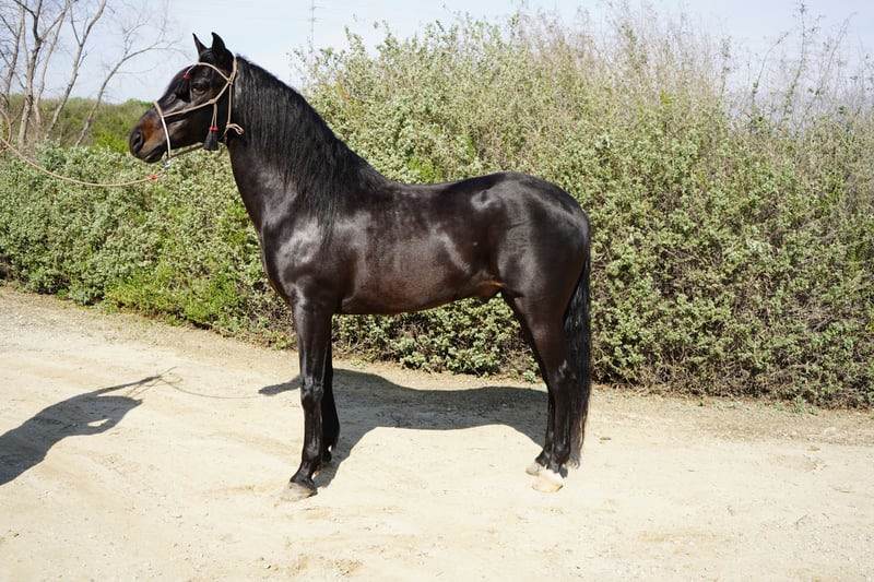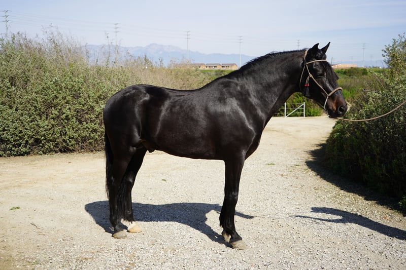 Exceptional Paso Iberoamericano stallion, born in 2021, standing at a well-balanced height of 15.2 hands. This striking black stallion has elegance and smooth gaits making him an ideal choice for riders seeking a versatile and reliable trail partner. With his calm demeanor and well-ridden temperament, he's learning to navigate a variety of trail environments. His natural gait and balanced conformation ensure a pleasant experience for both rider and horse, whether on leisurely hacks or more demanding trail adventures. This young stallion shows great potential for further training and development, making him an excellent prospect for riders looking to bring out his full potential. His striking black coat and refined appearance make him a true eye-catcher in any setting. A fantastic opportunity for those seeking a beautiful horse with a friendly disposition and trail-ready attitude. Don’t miss the chance to add this promising young horse to your stable! Option to geld.
