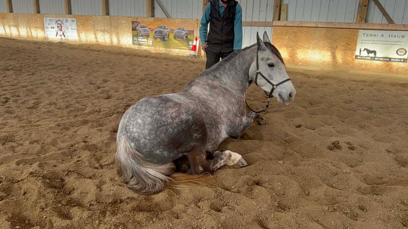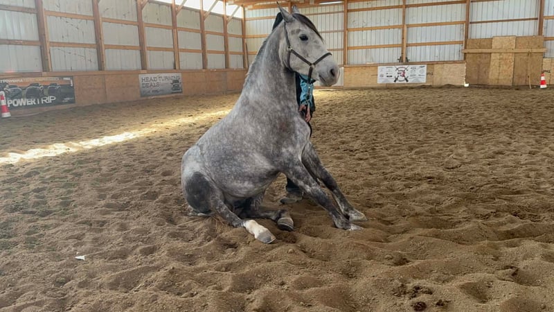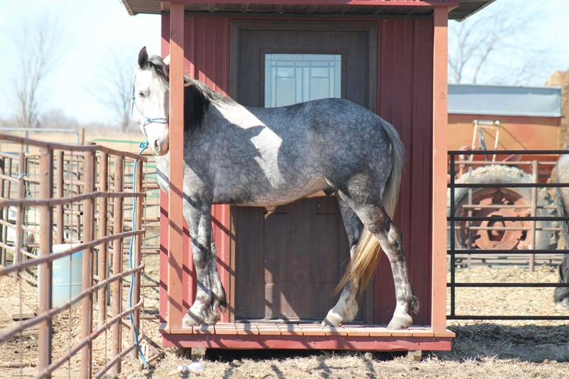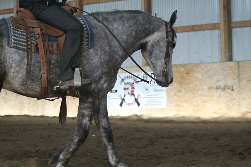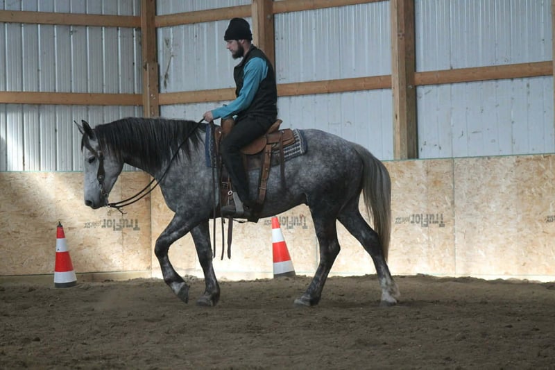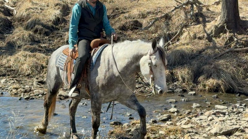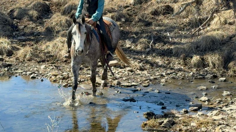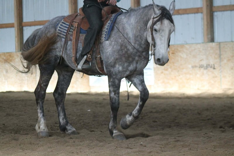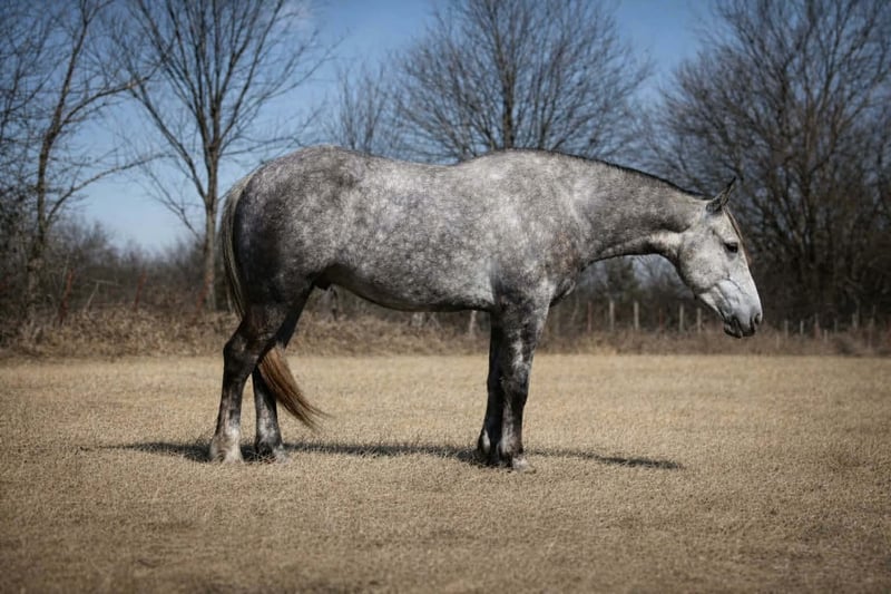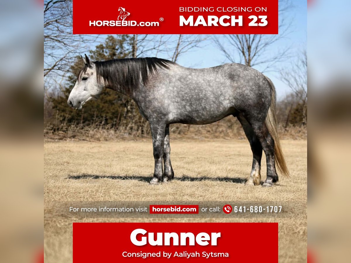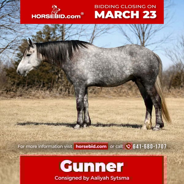 ⚜️𝓽𝓱𝓮 𝐆𝐎𝐋𝐃 𝓢𝓮𝓵𝓮𝓬𝓽⚜️ Happening now thru MONDAY | MARCH 23rd - Available EXCLUSIVELY on HorseBid's website! For more details and to register visit: www.Horsebid.com CONSIGNOR CONTACT: Aaliyah Sytsma 641-680-1707 LOCATION: Cincinnati, IA BREED: Percheron/QH REGISTERED: No COLOR: Grey HEIGHT: 15.2 AGE: 4 GENDER: Gelding Gunner is a 4 year old Percheron/QH cross grey gelding standing 15.2 hands tall. This guy is picture perfect, well trained, personable, and even started on a couple tricks! Gunner is easy to catch, stands quietly, easy to tack up, great for the farrier and vet, low in the pecking order, and clean in a stall! In the arena this horse is just about as fancy as you can ask a crossbred to be. He collects up in the bridle, very respectful to leg cues, side passes and pivots nicely. He has the cutest jog, and a very smooth lope! I truly think this is the brokest crossbred I have swung a leg over so far. Out on the trails Gunner will walk slowly up and down hills, steadily over water and mud, and carefully through his brush. He aims to take of his rider in all situation’s! Down the highway he isn’t phased by big semis or loud motorcycles, he walks down the road level headed and quiet! Gunner is 100% sound, current on all cares, and comes with a custom leather halter. This is the type of gelding that gets you noticed and everyone will brag about!