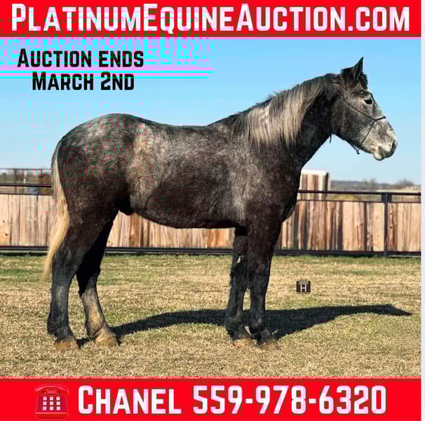 ONLINE AUCTION Place your bids at www.PlatinumEquineAuction.com Starting Bid $3500 Auction ends March 2nd, 2025 Need a new saddle? Check out White Rock Saddles on our website or Facebook! Blue is a 3 year old Draft Cross gelding standing 16.3 hands with all the dapples you could ask for. He is the kindest eyed and old soul type that is very gentle and laid back. Blue has never hesitated to do anything we have asked of him and is amazing to ride out on the ranch and down the trails. He is broke to drive and traffic safe. Blue is soft in the face and has some collection, a nice stop, and moves off leg well. We think he would make an awesome fox hunter if you wanted to go that route! He hauls well to new places and will go out alone with confidence or cruise in a group. We have checked cows on him, he loves the water, and can climb up and down absolutely any terrain. While Blue is young, he has the true draft demeanor of being born broke and gentle. He has never offered any funny business and has great manners. We believe Blue could fit just about anyone and any program. He is sound and UTD. FMI call/text Holland Horse Co. Chanel 559-978-6320. We can help arrange shipping nationwide from Jacksboro, TX. ONLINE AUCTION Place your bids at www.PlatinumEquineAuction.com Starting Bid $3500 Auction ends March 2nd, 2025 Need a new saddle? Check out White Rock Saddles on our website or Facebook!
