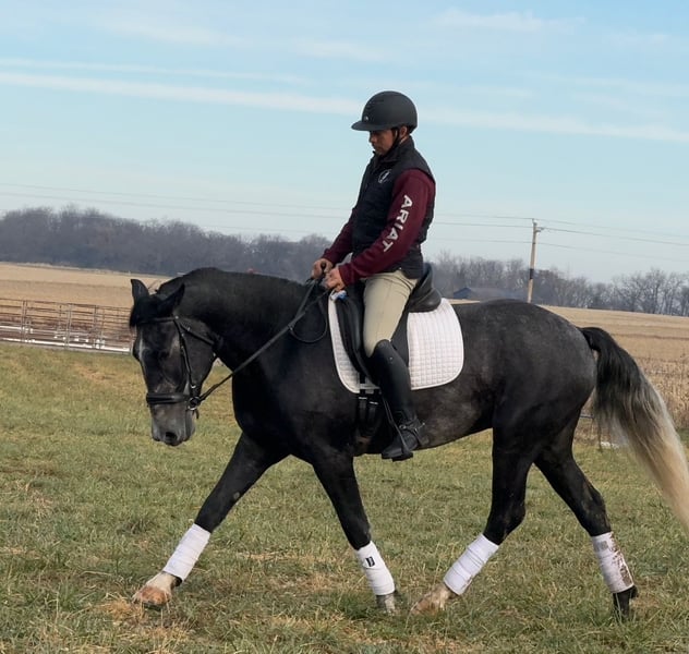 APRIL ALL STAR LINEUP ↞ 1923 Edition ↠ Happening now thru MONDAY | APRIL 21ST - Available EXCLUSIVELY on HorseBid's website! For more details and to register visit: www.Horsebid.com CONSIGNOR CONTACT: Helmuth Equine 515-460-9191 LOCATION: Ames, IA BREED: Percheron/Quarter Horse Cross REGISTERED: No COLOR: Gray HEIGHT: 15.2 AGE: 5 GENDER: Gelding Meet Casper, a 6 year old 15.2 hand gorgeous percheron quarter horse cross gelding that’s an absolute one of a kind. Casper is very well trained to ride and drive in almost every type of scenario. He’s the type of horse you can ride every day or once a month and he’s always willing to do whatever you want. He rides both English and western. He has nice enough movement for dressage or he can jog like a quarter horse. He would be a fantastic candidate for ranch horse shows because of his willingness to do anything you ask of him and he stays calm and quiet no matter where you take him. He will go down any trail, through water, up and down banks and hills, through town and even the drive-thru! He is truly safe enough for any amateur to ride or drive on any type of trail. We have used Casper to drive with young green horses in harness and he handles it like a champ. Casper is 100% sound and heathy in every way. He can happily live outside in a herd or in a stall with zero issues. He’s an easy keeper with excellent feet and no extra maintenance required. This special guy has been around the farm for some time now and has experienced almost everything we have to offer. He had the winter off and we just put him back to work and he acted like he never missed a day. Truly a sweetheart of a horse that will win your heart! He currently has his winter coat but as you can see when he sheds off he’s an absolute stunning grey that you can’t take your eyes off.