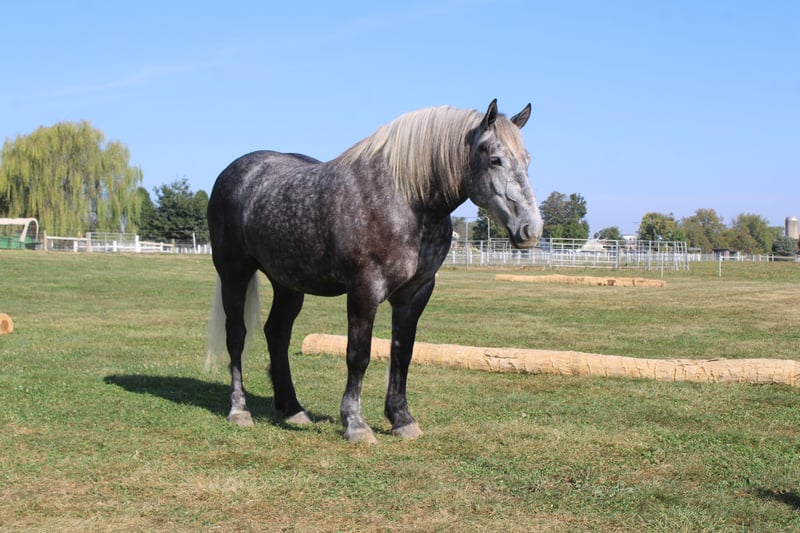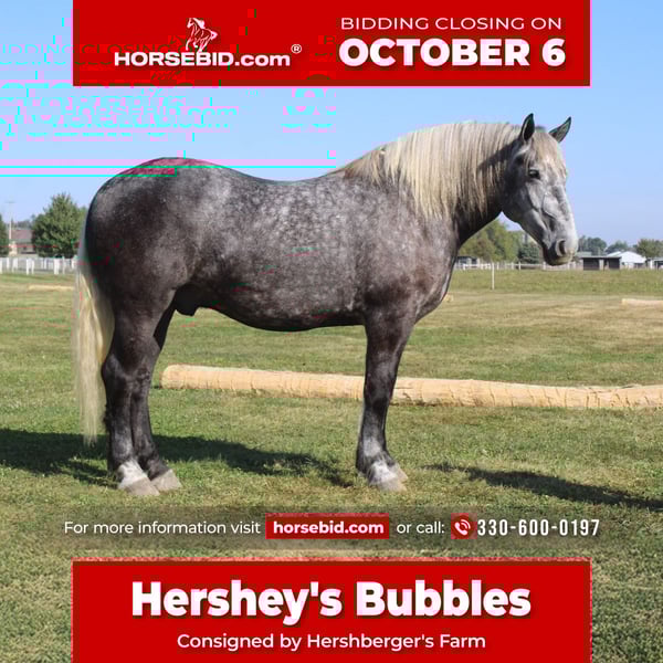 🍂 𝓐𝓾𝓽𝓾𝓶𝓷 𝑨𝑳𝑳 𝑺𝑻𝑨𝑹 𝑳𝑰𝑵𝑬𝑼𝑷 🍂 Happening now thru MONDAY | OCTOBER 6th - Available EXCLUSIVELY on HorseBid's website! For more details and to register visit: www.Horsebid.com CONSIGNOR CONTACT: Hershberger's Farm 330-600-0197 LOCATION: Millersburg, OH BREED: Percheron X Quarter Horse REGISTERED: No COLOR: Grey HEIGHT: 16.1 AGE: 4 GENDER: Gelding Meet Hershey's Bubbles!!! Bubbles is a once in a lifetime find that will get along with just about anyone. He is 4 years old and is a 3/4 Percheron and 1/4 Quarter Horse. Hershey's Bubbles is about as BOMB PROOF and safe as you can find a horse!! His sweet attitude in the barn and his willingness on a trail ride will please anyone. He is absolutely traffic safe and on trails he will step over logs and go through streams with no issues. Bubbles picks up both leads and has been ridden English, Western, or bareback. At 4 years old Bubbles is very mellow and safer then most horses. He has been used here to give rides and also has been in our petting area a lot. He is very gentle with kids and is sure not to nip their fingers when they feed him carrots. Bubbles has been driven single a lot as well as double with another horse. Bubbles has absolutely no fear and will go through whatever you point him at. He is the type of horse that if you can climb on his back you can ride him. It doesn't matter if you use him once a month or every day he will always be the same. He stands nice to tack up and to mount. Bubbles also comes running up to the gate when you whistle at him when he's out in the pasture. He does great at picking up his feet and also loves getting a bath. His beautiful color grabs everyones attention as he goes by. He's been Downtown on busy highways and there is no truck big enough to spook him. If you like a pretty horse and if safety means anything to you, you just can't afford not to have a horse like Hershey's Bubbles!!!! To learn more about Bubbles call or text 330-600-0197.