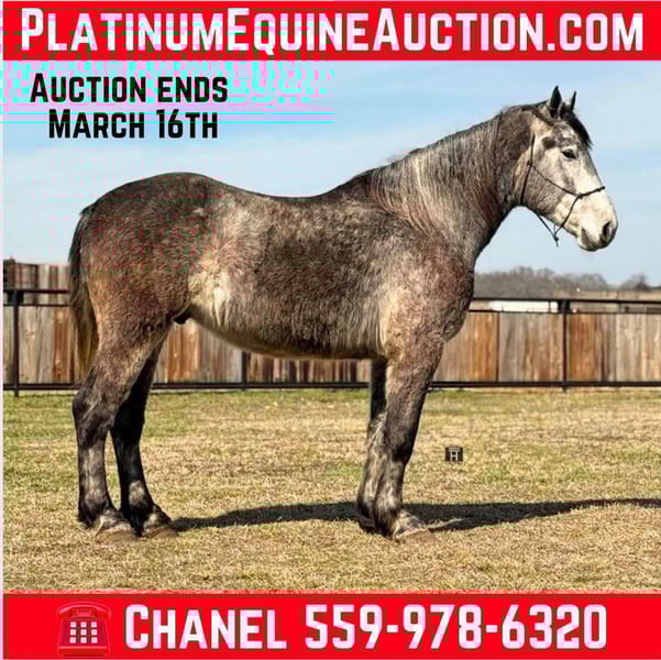 ONLINE AUCTION Place your bids at www.PlatinumEquineAuction.com Starting Bid $3500 Auction ends March 16th, 2025 Need a new saddle? Check out White Rock Saddles on our website or Facebook! Meet Garfield – a 16.1 Hand, 4 year old draft cross gelding. We absolutely love the gelding and have nothing but amazing things to say about him. He is GENTLE, kind, willing and very laid back. We feel that almost anyone could ride this guy. He is very easy to ride as well as handle on the ground. He rides Western, English, Drives single and double and is started over fences. He has a ton of potential as a fox hunter! We have taken him down the trails, freeways, and out to the ranch to both check cattle and just leisurely ride. He is not spooky, confident by himself, and a relaxing ride always. Garfield rides well in the arena and can walk, trot, and lope circles with a nice stop to him and natural collection. He is easy to catch, has great ground manners, loads, ties, bathes and is always on his best behavior. He is barefoot and sound/straight/clean legged. UTD. FMI call/text Holland Horse Co. Chanel 559-978-6320. We are located in Jacksboro, Texas and are happy to arrange shipping nationwide. ONLINE AUCTION Place your bids at www.PlatinumEquineAuction.com Starting Bid $3500 Auction ends March 16th, 2025 Need a new saddle? Check out White Rock Saddles on our website or Facebook!