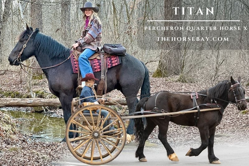 Titan is a beautiful black Percheron/QH Cross gelding. 6yo with his whole life ahead of him. Standing a stout 15.3hh, this guy can pack a larger rider & look great doing it. Don’t let his size fool you, though. This big guy is athletic when you ask him to be & he loves to jump!! In our videos, you’ll see a young man take him over some jumps with ease; that was his first time riding Titan. He is user-friendly for all. He has been used this year in my lesson & guided trail riding programs. As well as being leased out to competitors who want to attend our horse shows & don’t have a horse of their own. Titan steps up to the plate when someone needs a friendly & fun ride. Navigates the tough trails with ease. Willingly crosses all types of obstacles in hand & under saddle. He’s done great at the extreme trail challenges. He’s sure-footed & goes over downed trees, through mud & up rocky trails without issue. He makes riding fun. Our lesson kids call him one of the favorites. He loads on many styles of trailers without any fuss & backs off like a pro. His sweet & gentle disposition makes him a great mount for an intermediate rider. This boy loves cattle work!! Ridden weekly at the stockyard & adds more cow sense each time. He really enjoys that work. He stands great for clipping, farrier & vet exams. He sells sound & ready to go to work for you. This guy rides like a dream & is adding buttons all the time. As good as he rides, he drives just great! This guy backs in the shafts & waits for your cue. Perfect for carriage rides, field work, or pony parties. Titan sells UTD on teeth, shots, and farrier work & is being offered with a full vet exam & check up. Buy with confidence!! He loves to stand for hours of grooming from the little kids. He’s great for mounting, bathing & many other tasks he’s been asked to perform. He’s an all-around good boy. Easy to halter & bridle. Gets along great with others in the field. He stalls or pastures great. Picks up all 4 feet when asked. He’s been a pleasure to have at our place. Whoever gets this big guy will have a friend for life!
