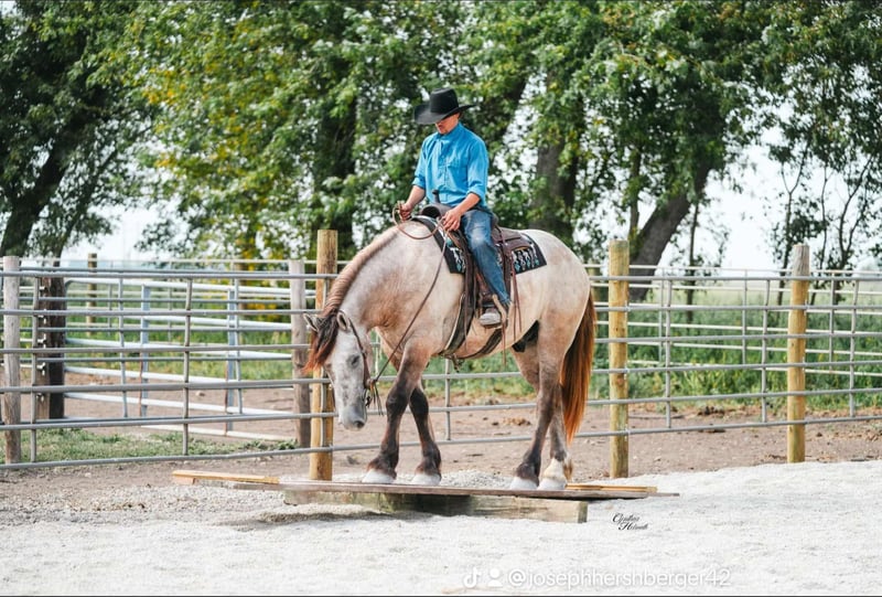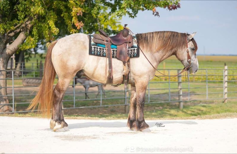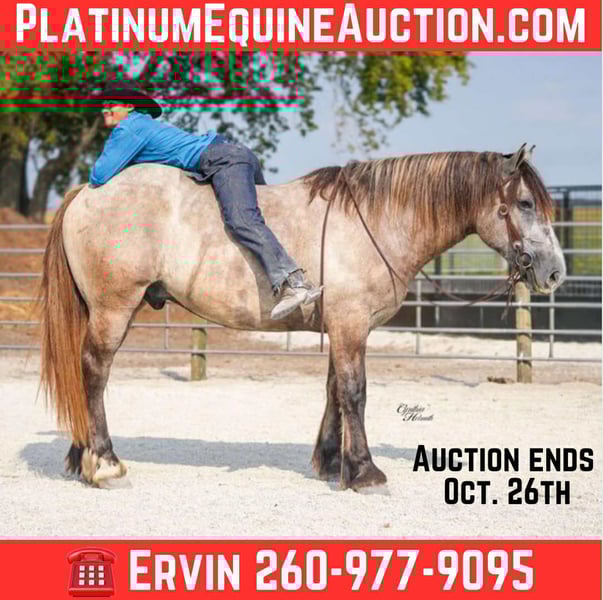 ONLINE AUCTION Place your bids at www.PlatinumEquineAuction.com Starting Bid $3500 Auction ends October 26th, 2025 Need a new saddle? Check out White Rock Saddles on our website or Facebook Badger is a stout built, 16.1hh, just turning 5 year old, grey draftcross gelding. He has been ridden every where that you could ask one to go… Lots of outside miles, down the trails, across the creeks, ditches, deadfall… he does it all! He handles any obstacles that are in his way, is safe to ride down the highways and through town as well. He rides well in the arena and does fine in a group as well as alone. He neckreins around nice, takes his leads, lopes nice circles and has a good stop. Badger is a great size that will fit any level of rider, right down to the youngest ones yet he is stout enough to carry any adult. He is the friendliest horse that you will ever meet and loves attention. He is farrier friendly, he tacks up quietly and walks right off when asked after he is mounted. He has been around lots of kids and loves attention and is easy to catch as well. He absolutely does not buck, bite or kick as he is totally safe and well trained. In addtion to riding Badger also drives very well, whether in the field, down the highways or through town. Badger is blemish free, has had all of his shots, and has been dewormed. He sells 100% sound and sane. We invite anyone to come see and ride him in person so they can understand how truly awesome that he is! Located in Independence, IA. Contact Ervin with Platinum Star Stables 260-977-9095 with any questions. ONLINE AUCTION Place your bids at www.PlatinumEquineAuction.com Starting Bid $3500 Auction ends October 26th, 2025 Need a new saddle? Check out White Rock Saddles on our website or Facebook
