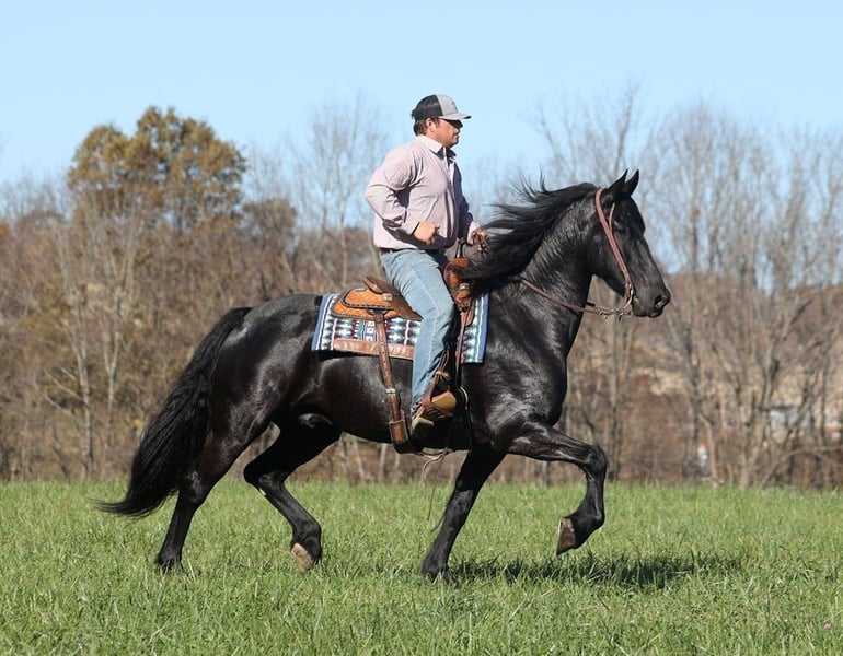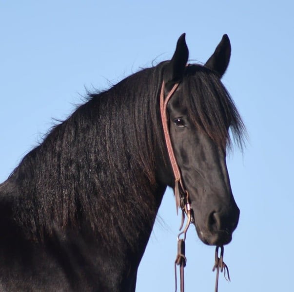 ONLINE AUCTION Place your bids at www.PlatinumEquineAuction.com Starting Bid $3500 Auction ends November 24th, 2024 Need a new saddle? Check out White Rock Saddles on our website or Facebook! Get you a big eye full of this hansom rascal!! Del Fuego is a 2019 model, 16-16.1h, jet black Friesian Sport Horse gelding that is built like a tank! Fuego is a FANCY looking and fancy moving dude!! He will go anywhere that you point him on the trails, whether that is steep slopes, over deadfall, across rivers or rough terrain, he handles it with ease! He has been ridden around cows. He has been desensitzed to tarps, balls and whips. Fuego lopes nice circles, has a good stop and backs. Fuego has also been driven under harness. Fuego requires no maintenance and stays sound even with hard work. For more info contact Lucky 13 Equine Lysandra 765-717-2041 or Matt 765-698-4655 Located in Brodhead, KY. ONLINE AUCTION Place your bids at www.PlatinumEquineAuction.com Starting Bid $3500 Auction ends November 24th, 2024 Need a new saddle? Check out White Rock Saddles on our website or Facebook!