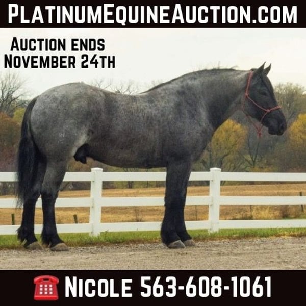 ONLINE AUCTION Place your bids at www.PlatinumEquineAuction.com Starting Bid $3500 Auction ends November 24th, 2024 Need a new saddle? Check out White Rock Saddles on our website or Facebook! Bruno an absolute stunning Blue roan Percheron/ QH cross gelding that is extremely gentle, genuine and soon to be your next best friend. At 5 yrs old he has an old soul with a been there done that attitude. Standing a perfect 16 hands tall Bruno is broke to ride and drive you can’t go wrong with him. He stands to harness, hitch, tack, mount, and groom. He is easy to catch and will meet you at the gate every time. He’s done his fair share of ranch work, seen a lot of cattle in wide open country and has had a lot of colts ponied off him. Bruno has been through the obstacle course and takes everything in stride. He has very smooth gates and his lope is just as comfortable as reclining back the lazy boy in the living room. He’s been to town and really enjoys seeing the sights and sounds along with all the attention he can soak up, as he strives to be the center of attention. Bruno has had many deferent levels of riders on him from advanced to timid beginners and he always takes great care of everyone. He is surefooted in the most difficult terrain, and will go through deep water. Bruno crosses wooden bridges, he is traffic safe and Bruno is definitely a unicorn and ready to be your next best friend. He is UTD on farrier, dental, coggins and comes with a pre purchase exam from our vet. Bruno sells 100% in every way with no scars or blemishes what so ever. FMI call/text Nicole Clark 563-608-1061 Located in Bloomfield, Iowa. Happy to answer any questions or help arrange shipping. ONLINE AUCTION Place your bids at www.PlatinumEquineAuction.com Starting Bid $3500 Auction ends November 24th, 2024 Need a new saddle? Check out White Rock Saddles on our website or Facebook!