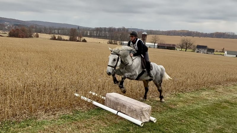 ⚜️ 𝓽𝓱𝓮 𝐇𝐨𝐫𝐬𝐞𝐦𝐚𝐧'𝐬 𝓢𝓱𝓸𝔀𝓬𝓪𝓼𝓮⚜️ Happening now thru MONDAY | DECEMBER 1st - Available EXCLUSIVELY on HorseBid's website! For more details and to register visit: www.Horsebid.com CONSIGNOR CONTACT: CM Farms 717-875-2061 LOCATION: Gap, PA BREED: Perch/QH REGISTERED: No COLOR: Grey HEIGHT: 17 AGE: 7 GENDER: Gelding Here’s the highlight of our year — meet Silver! The ultimate guest horse! This breathtaking horse is a 7-year-old Percheron/QHx gelding standing a sturdy 17hh. Silver was put together right — he’s got curves in all the right places, he is quite substantial, making him great for a variety of different riders, and his brain is simply unbeatable! He is broke to ride Western, English, bareback, and broke to drive single or double. He will lay down on command to mount or dismount! Although Silver is a big boy in every way, he is able to be athletic and has one of the cutest jumps in the barn. This guy has blown us away with not only his beauty, but his quiet, unfaltering mind, and we can guarantee he will do the same wherever he goes! Under saddle, Silver is hands-down one of the most fun and safe horses to ride! He’s so incredible — we have even ridden him bridleless at the walk, trot, and canter. He’s well educated with walk-to-canter transitions, he neck reins and direct reins, he moves off of leg, and he’s adjustable at all three gaits. His trot and canter are some of the most comfortable we’ve ever ridden — incredibly easy to sit — and at the canter he will make you feel like you’re on top of the world! He responds well to voice cues and will stop on a dime with just a “whoa” or by sitting back. He is fun for any level of rider because he does not get upset if you make a mistake or flop around, and he has enough buttons to keep things fun for someone more advanced. He is more of a push ride, and you can have plenty of leg on him; however, he’s always responsive when you ask him to go and will carry himself very well. This guy is so well balanced, steady, and willing to please. He is even able to canter little circles in both directions and leg-yield at all three gaits. He’s one you could take into the dressage ring tomorrow, and we don’t doubt he’d clean up the ribbons. On the trail, Silver keeps the same steady mentality. He’ll pack anyone you put on him with reliability, a sure foot, and a happy attitude. He’s the same horse off property as he is at home- and he’s the same horse EVERY time you pull him out. This handsome man has been everywhere — from cantering through open fields, going up and down windy wooded trails, through creeks, over bridges, and through tunnels — he’s even ridden right into town and through the drive-thru! You can take him to the grocery store, tie him up while you shop, and come back out to find him waiting patiently. He is unflappable, sturdy, and will lead, follow, or go anywhere you put him in the group. He doesn’t mind if another horse rides too close to him and seems to get along with everyone. Silver has been out on multiple hunter paces with us this past fall, and he would make an incredible candidate for fox hunting. This gelding is extremely honest to all the jumps, whether it be logs, coops, or even the silly inflatable kinds — point him in the right direction, and he will take care of everything else. He has also been cross-country schooling with us and proved himself to be extremely athletic and cute with his form and knees. He did the ditch combination with no hesitation — and if you are familiar with how difficult that is for some horses, that says a lot in itself! He is so big that when he takes a larger jump it feels like you’re popping over a crossrail. He’s jumped some sizable 3’–3’3” coops and could likely even do bigger! This guy will give you a feel like you’re floating on air, and his confidence truly will make anyone a better rider! In the barn, Silver is really just an oversized puppy dog. He loves people, loves being brushed, and loves getting any type of attention! Most importantly, he has good manners in his stall, to tack up, and on the ground. This giant love bug is the type of horse that will meet you in the pasture when he sees you coming- and is always happy to spend quality time with his person. Once you’re done riding him, he will follow you anywhere like a puppy — no lead rope required! He loads right into the trailer, gets along with everyone, and is genuinely such a fun horse to have in the barn. Staying true to his typical draft nature, the one area Silver could still use some work on is picking up his feet. Our farrier has used stocks with him, because it's easier on his back; however, even he said Silver has one of the best temperaments, and with just a couple more sessions and some practice, he wouldn’t need them anymore. This is something we are continuing to work on until he leaves. Special ones of his size, athletic ability, and incredible temperament do not come around very often — he is truly a once-in-a-lifetime type of horse. We have all fallen in love with him at our barn and cannot say enough good things about him. He will be your best friend, and the kind of partner you’ll never EVER be able replace.
