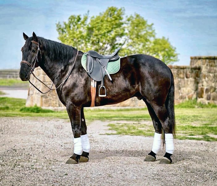 ONLINE AUCTION Place your bids at www.PlatinumEquineAuction.com Starting Bid $3500 Auction ends March 16th, 2025 Need a new saddle? Check out White Rock Saddles on our website or Facebook! Batman is a fancy, 7-year-old Friesian cross gelding, standing at 17.1 hands. I would consider him a once in a lifetime horse! Pictured is an 8-year-old girl riding him bareback with only a war bridle in his mouth while he is staying a complete gentleman the whole ride! This flashy, solid jet black gelding catches everyone’s attention everywhere he goes! He is by far one of the friendliest horses l’ve ever met or owned. I don’t think anyone ever told him that he is a horse and not a dog. While his personality is as big as he is, he will still be a respectful gentleman! “He is a really nice horse, if I was in the market this is the horse I would purchase” -DVM Tim Holt Batman is so light you can ride him in something as simple as a war bridle or even a rope around his neck! He’s so willing he will just about put the bridle in his mouth himself! He is soft in the bridle, side passes, moves off of leg pressure, rides out on a nice loose rein, has a big stop and picks up all gaits- BROKE & GENTLE for anybody. He is broke to ride western/ English AND drive! He bathes, clips, haro ties, cross ties, and is good for the farrier. He stalls well and does not crib, weave, pace, or kick. He stands quietly to be saddled, bridled, and mounted. He is Up to date on all shots-farrier-teeth and worming! Batman will lope off bridled up and as smooth as a rocking chair. I find him to be one of the most well trained- easy going & downright gorgeous Friesian crosses you can come across. This is a horse that is versatile and will be someone’s lifelong partner and best friend. Located in Post Oak Bend City, TX. Call Canyon Creek Ranch Rachel 805-453-3410 with any questions. ONLINE AUCTION Place your bids at www.PlatinumEquineAuction.com Starting Bid $3500 Auction ends March 16th, 2025 Need a new saddle? Check out White Rock Saddles on our website or Facebook!