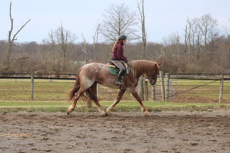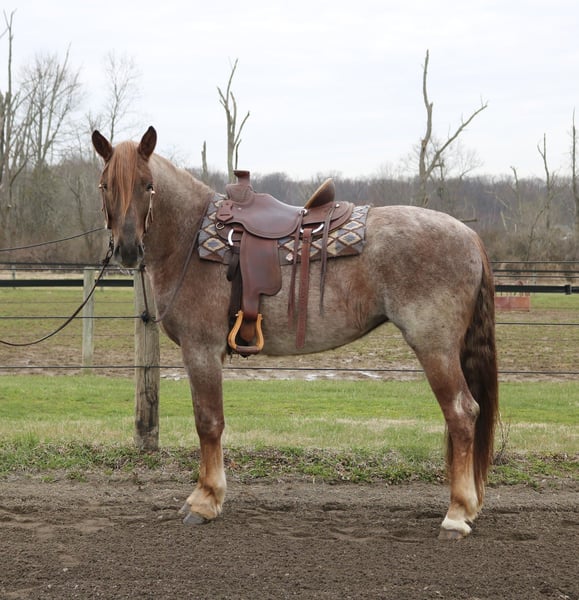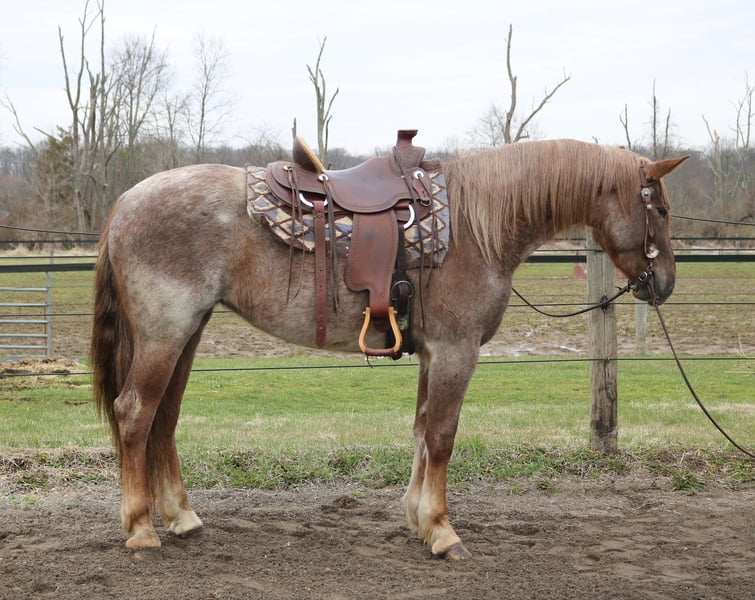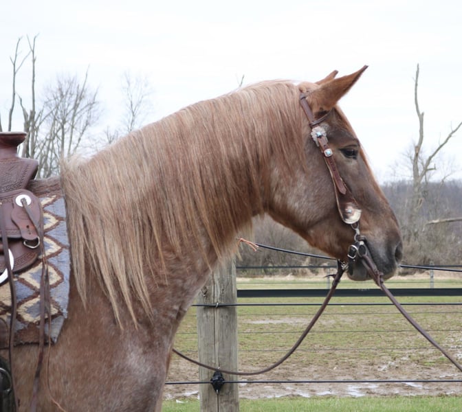 Sedona, cavalla di 4 anni, altezza 16.1 hh, roano rosso, incrocio Percheron/Frisone/QH