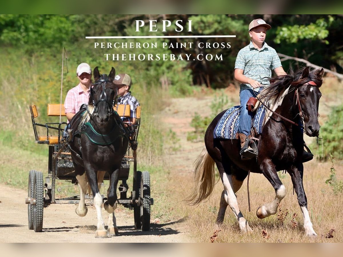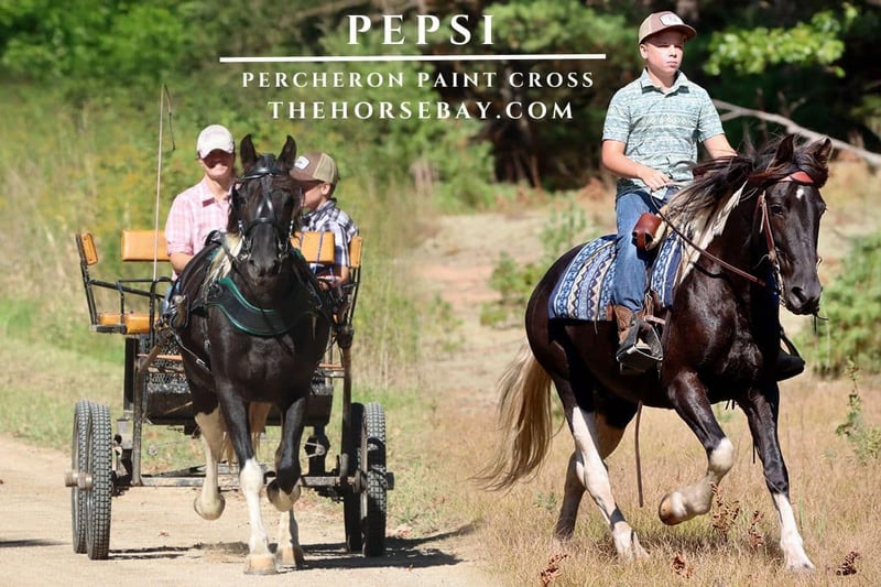 Meet Pepsi she is a 14.2 hand Percheron Paint cross Mare and at the perfect age of 7yrs old. Still young, but old enough to have been there and done that. She both rides and drives! And she is very safe both ways. She is also nice a stocky and can easily carry a bigger rider. And not only that you get a surprise in June 2026 that is when she is due to have a nice Gypsy foal. She has been ultrasounded in foal. The sire is a registered 15 hand tall Gypsy and very handsome gray color. So, the baby could be a beautiful dapple gray or come out black and white like Pepsi. Either way it’ll be a very nice cross and eligible for Gypsy sport horse papers. Pepsi is a good mom has had a few babies already and each baby is nice and stocky with feathers. And she takes great care of them. So, for driving and riding I would consider her advanced beginner safe. She does NOT spook easily in fact I haven’t found anything that really phases her. She is totally traffic safe she has seen loads of traffic and doesn’t blink an eye at semis coming up behind her or at her. DRIVING: She stands still for hitching, stop signs/lights, getting on and off the cart. She knows the words easy, trot, walk on, and whoa. She doesn’t care a bit about traffic. She has a 12 yr old beginner driver behind her driving her for most of the video clips you will see in her video. And she’s been driven by younger kids than that, so she is very safe under harness. You could almost put her in self drive mode she can read most stop signs. And she’s easy on the lines and can side pass over in the cart to make sharp turns. RIDING: She is excellent under saddle she’s a NO fuss NO muss type of gal. She has been there and done that. I would consider her kid safe all the way up to grandma safe. She has absolutely NO bad habits or vices. She takes care of her rider and again she does NOT spook easily. She has an easy to post to trot and a VERY smooth canter. So smooth that she’s the go to horse to teach someone how to sit a canter because hers is effortless to sit to. Very nice rocking chair lope. She will cross anything you ask nothing phases her. She crosses big logs, creeks, rivers, little wooden bridges, and big bridges with guardrails. She’s basically a horse that you point and she goes. She has been there and done that a hundred times over. She is a very versatile horse and checks all the boxes. You can’t go wrong with Pepsi and I would say if you can’t ride/drive her you shouldn’t own any horses. That’s how easy she is to get along with. In the video the boy that is riding her is an advanced beginner rider and you can see how easy it is for him to ride her. And the other thing I love about her is she is sensible. She doesn’t get excited if the other horses leave her behind. They can take off ahead of her and she’ll stay walking. She will leave home alone fine. And rides fine in a group front, back, or middle. She will also separate out on the trail. She has great ground manners and loads right in the trailer and backs right out. She stands still for mounting. She’s easy to catch has a nice friendly personality. Gets along out in the pasture I would say maybe middle of the pecking order. She’s an easy keeper NO maintenance required. She is up to date on everything vet exam, shots, wormings, coggins, and farrier. Just give a call if you have any questions or want to come see her. Don’t miss out you’ll regret it if you do, she is a hard to find all around horse. She is one the whole family can enjoy both riding and driving. And not only that but if you have kids, they will have a fun little surprise by June to play with.