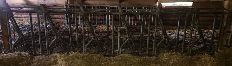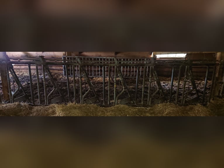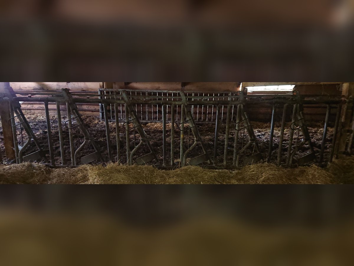 Selbstfangfressgitter: von Patura Bild 1: 6 Fressplätze, L 4,81-5m, NL 5m, gebraucht, 700€ VHB Bild 2: nicht von Patura, 6 Fressplätze, L 3,2m, gebraucht, 330€ VHB Bei Abnahme mehrerer Fressgitter Preisnachlass möglich. Aufgrund der Aufgabe der Mutterkuhhaltung stehen weitere Stalleinrichtungen zum Verkauf: leichtes Tor von Patura und Rundraufe.