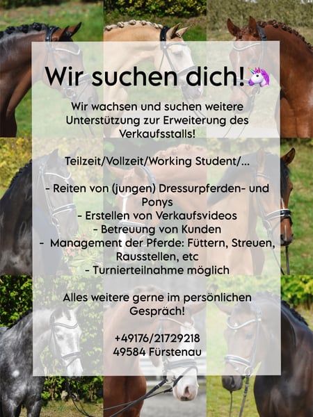 Looking for a trainer or groom (m/f/d) to join our sales stable in 49584 Fürstenau! We are seeking support for our team to manage approximately 20-25 sale horses. - Riding (young) dressage horses and ponies or preparing/cleaning them for riding - Taking sales photos and videos - Attending to customer appointments - Joint management of horse care: feeding, mucking out, turnout - Participation in competitions possible We are not necessarily looking for a fully qualified trainer, but rather someone with understanding and sensitivity for horses, and enjoyment in the work. A groom who assists with tacking up and handles all tasks related to riding is also welcome. Since most of our horses are young and well-behaved, experience with young horses is essential. Part-time, full-time, working student positions, internships, or similar arrangements are all possible. Regular working hours, fair pay, and a pleasant working environment are of course guaranteed! Please feel free to contact us for more information! +49 176 21729218