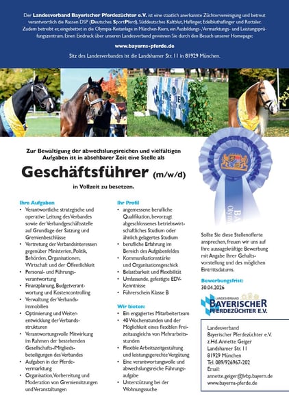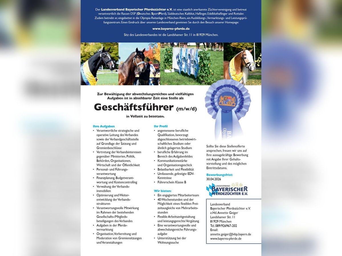 Zur Bewältigung der abwechslungsreichen und vielfältigen Aufgaben ist in absehbarer Zeit eine Stelle als Geschäftsführer (m/w/d) in Vollzeit zu besetzen. Ihre Aufgaben • Verantwortliche strategische und operative Leitung des Verbandes sowie der Verbandgeschäftsstelle auf Grundlage der Satzung und Gremienbeschlüsse • Vertretung der Verbandsinteressen gegenüber Ministerien, Politik, Behörden, Organisationen, Wirtschaft und der Öffentlichkeit • Personal- und Führungsverantwortung • Finanzplanung, Budgetverantwortung und Kostencontrolling • Verwaltung der Verbandsimmobilien • Optimierung und Weiterentwicklung der Verbandsstrukturen • Verantwortungsvolle Mitwirkung im Rahmen der bestehenden Gesellschafts-/Mitgliedsbeteiligungen des Verbandes • Aufgaben in der Pferdevermarktung • Organisation, Vorbereitung und Moderation von Gremiensitzungen und Veranstaltungen Ihr Profil • angemessene berufliche Qualifikation, bevorzugt abgeschlossenes betriebswirtschaftliches Studium oder ähnlich gelagertes Studium • berufliche Erfahrung im Bereich des Aufgabenfeldes • Kommunikationsstärke und Organisationsgeschick • Belastbarkeit und Flexibilität • Umfassende, gefestigte EDVKenntnisse • Führerschein Klasse B Wir bieten: • Ein engagiertes Mitarbeiterteam • 40 Wochenstunden und der Möglichkeit eines flexiblen Freizeitausgleichs von Mehrarbeitsstunden • Flexible Arbeitszeitgestaltung und leistungsgerechte Vergütung • Eine verantwortungsvolle und abwechslungsreiche Führungsaufgabe • Unterstützung bei der Wohnungssuche Sollte Sie diese Stellenofferte ansprechen, freuen wir uns auf Ihre aussagekräftige Bewerbung mit Angabe Ihrer Gehaltsvorstellung und des möglichen Eintrittsdatums. Bewerbungsfrist: 30.04.2026 Landesverband Bayerischer Pferdezüchter e.V. z.Hd. Annette Geiger Landshamer Str. 11 81929 München Tel. 089/926967-202 Email: annette.geiger@lvbp.bayern.de www.bayerns-pferde.de