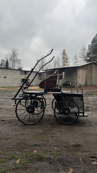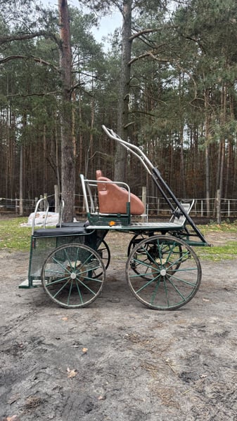 Robustly constructed, well-riding carriage suitable for medium and smaller horses. Mechanically and structurally in good condition, requires cleaning and repainting. Width: 125 cm Year of manufacture: approximately 2000. Newly fitted wheels, straight and undamaged. New shaft with storage compartment. New bearings on all wheels. Brakes on both axles. Holders for lanterns. It would be advisable to replace the foam padding in the rear seats. I am selling or trading for a larger marathon carriage, preferably with a brake on the pole.