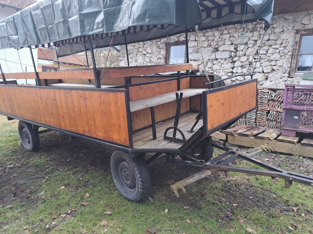 Verkaufen unseren Planwagen, er hat Patz für 20 Personen . mit Trommelbremse hinten hat eine Fußbremse und eine Feststellbremse. Die Deichsel kann gewechselt werden um mir Pferden oder Traktor zu ziehen . Ich Verkaufe den Planwagen da ich keine Verwendung mehr für ihn habe. wurde extra für uns gebaut. 1,8m breit Gesamtlänge 5,40m